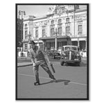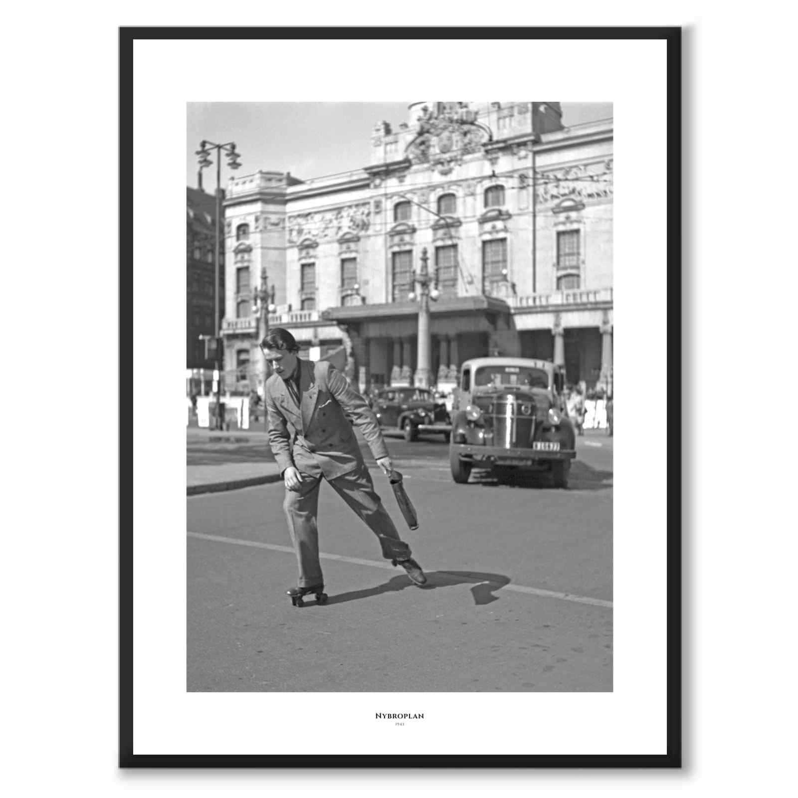 Bakom honom reser sig den pampiga fasaden vid Nybroplan, och tidstypiska bilar passerar längs gatan i det klara dagsljuset. Mannen lutar sig mjukt framåt, som om han förenar vardagens hast med ett lekfullt ögonblick mitt i stadens puls. Den skarpa kontrasten mellan hans stiliga framtoning och den oväntade färden på brädan skapar en tidlös scen full av rörelse och karaktär. Detaljerna i omgivningen skuggorna över stenfasaden, bilarnas runda former och stadens liv i bakgrunden fångar Stockholms 1940-tal med både värme och precision.