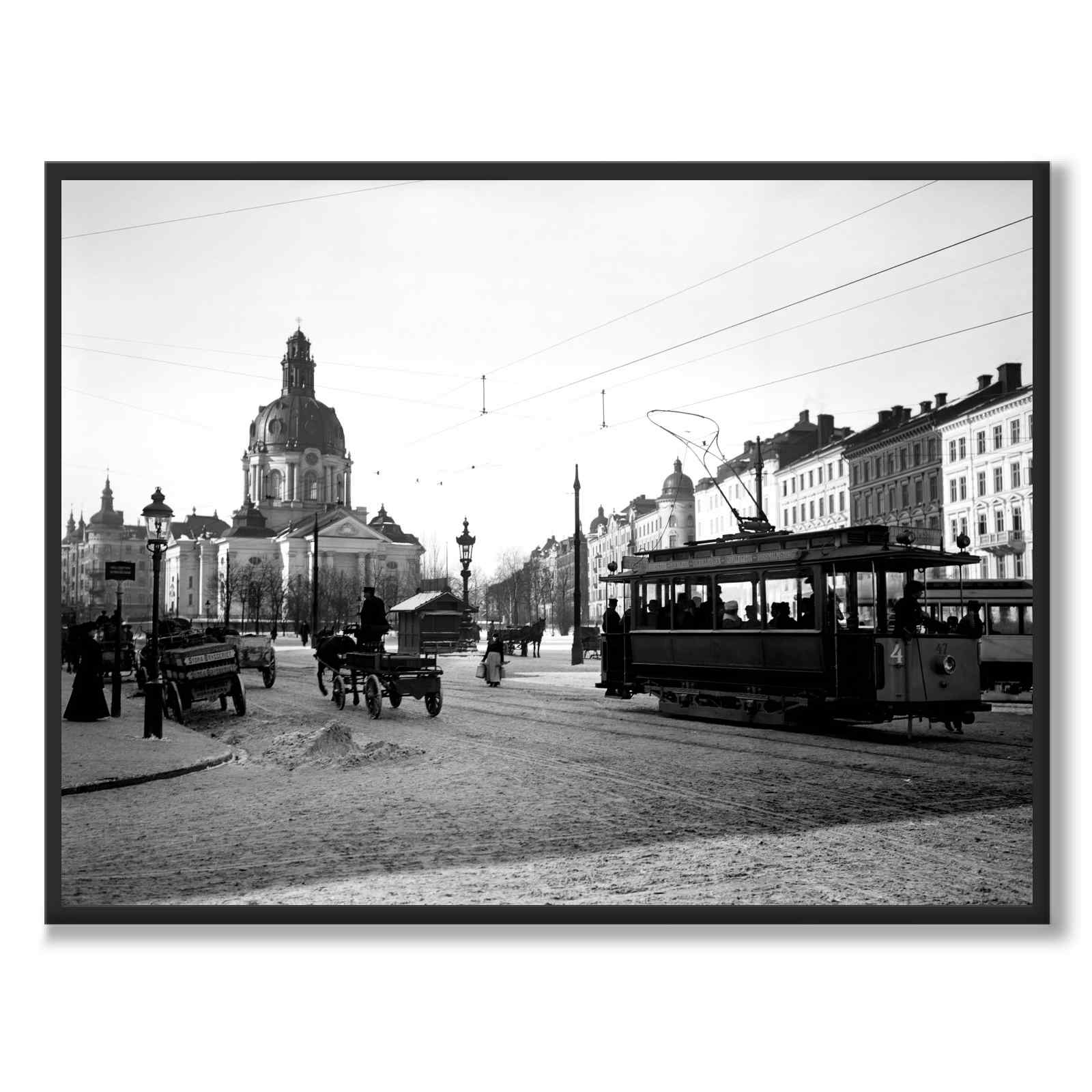 Odenplan i Stockholm år 1908. Vy mot Gustav Vasa kyrka. Det är vinter och på bilden ser vi ett tidtypiskt folkliv med ekipage och spårvagn som inte så länge sedan hade elektrifierats.