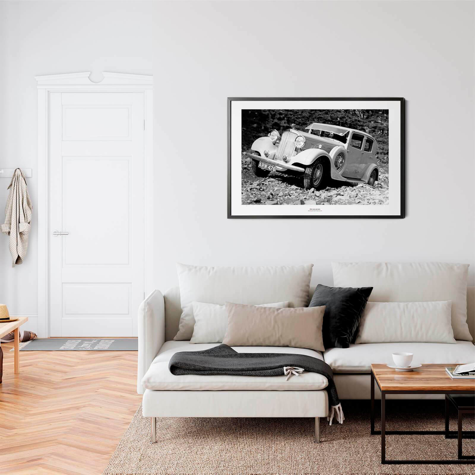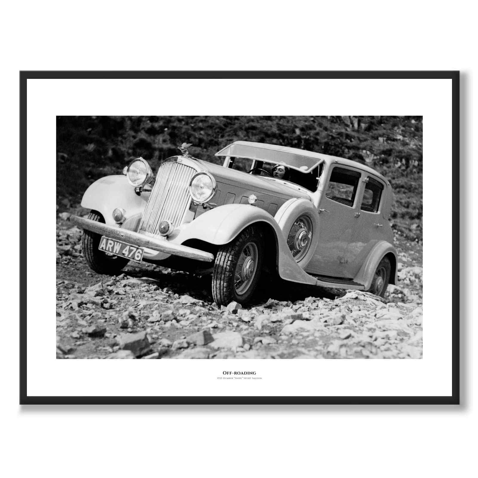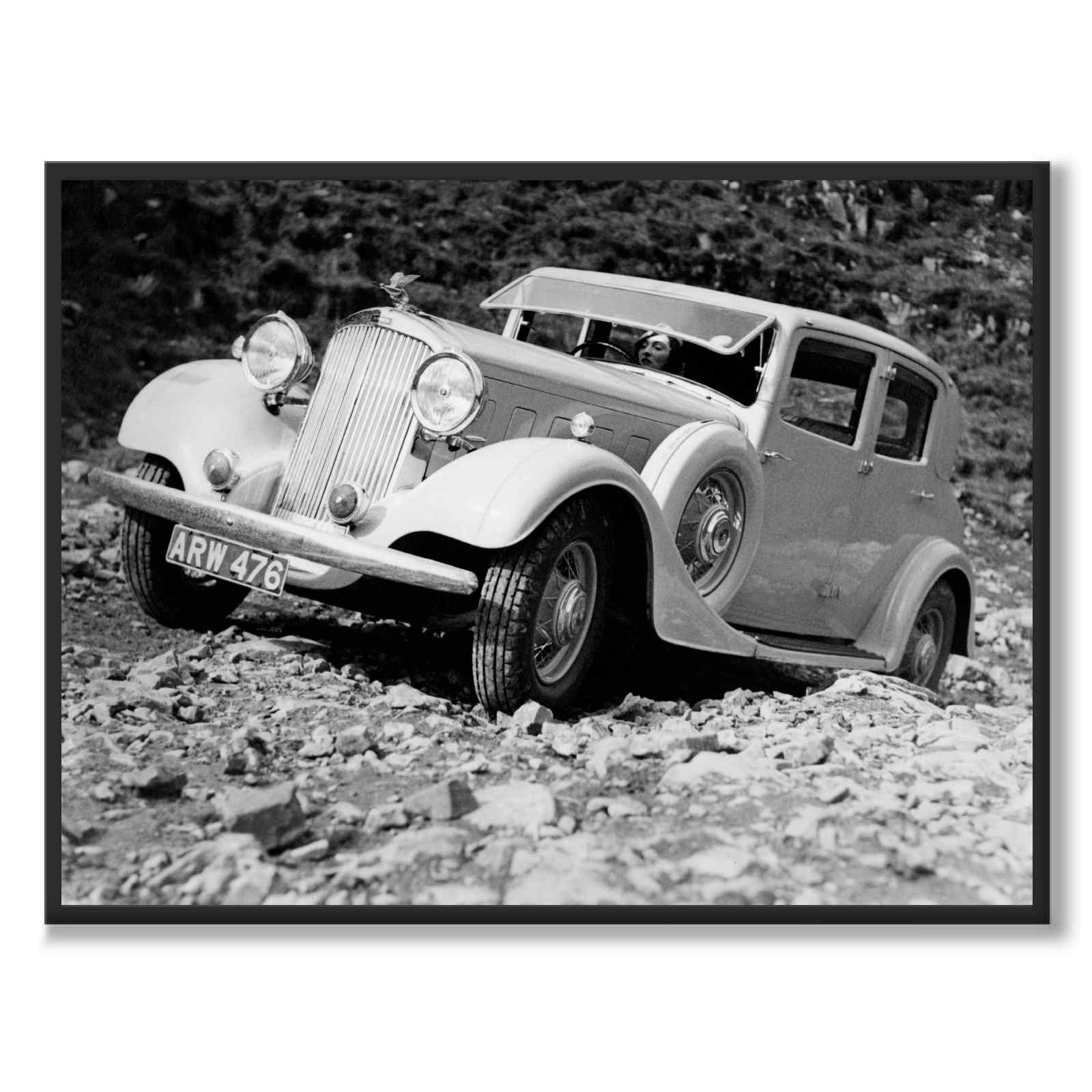 En lyxig Humber Snipe Sport Saloon kör i tuff terräng år 1935. I förarsätet sitter en vacker kvinna med mörkt läppstift och en exklusiv hatt typisk för årtiondet.