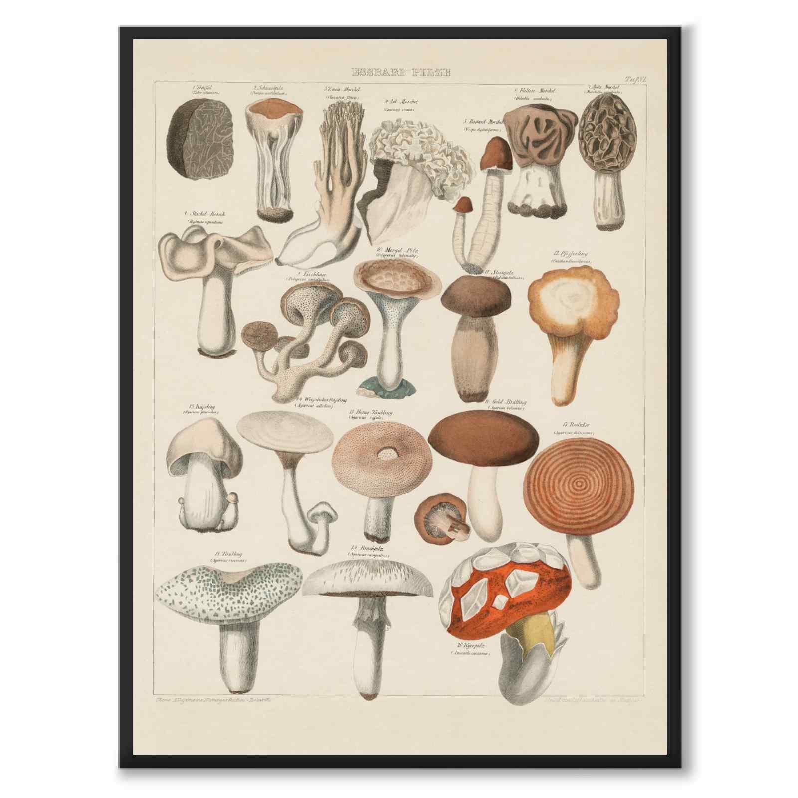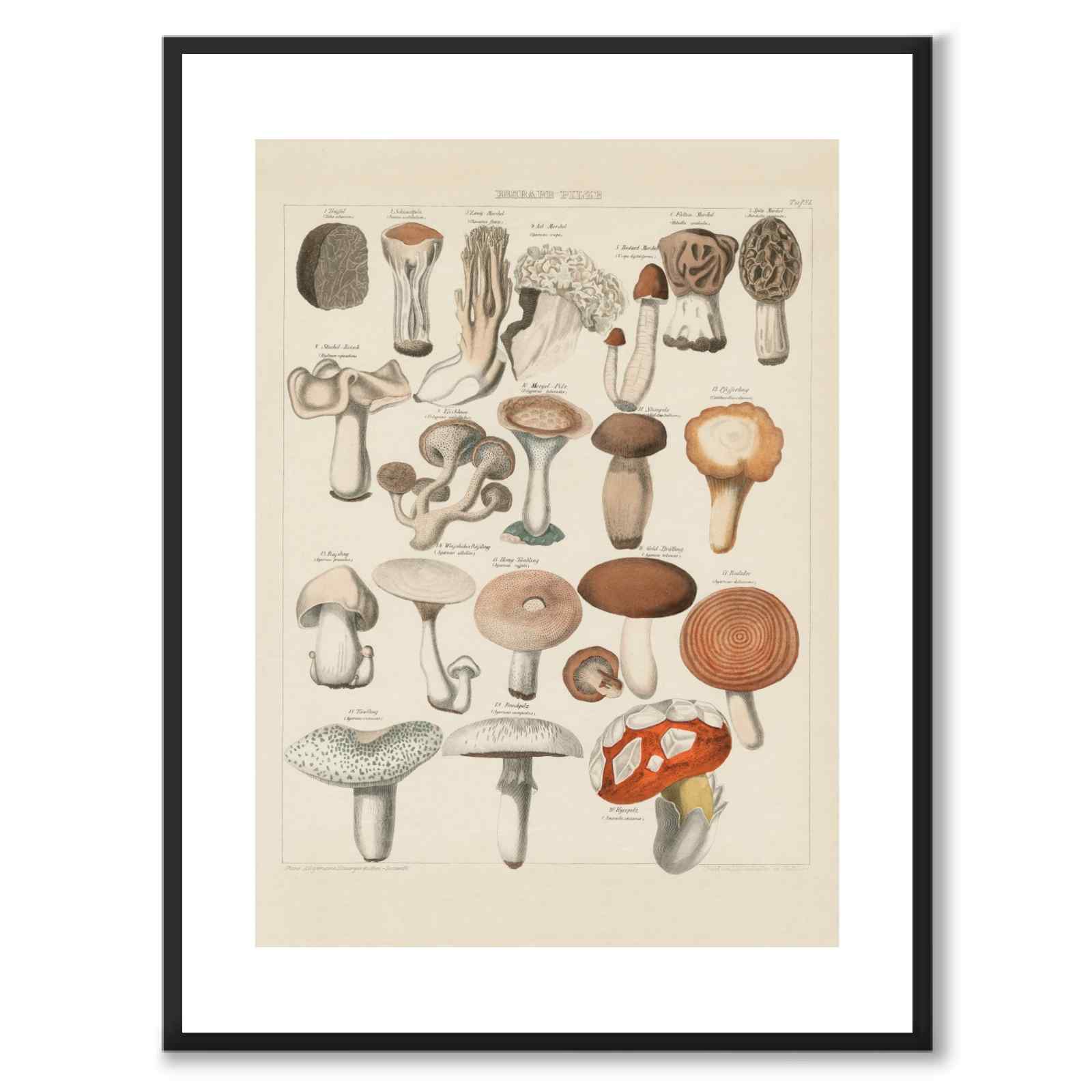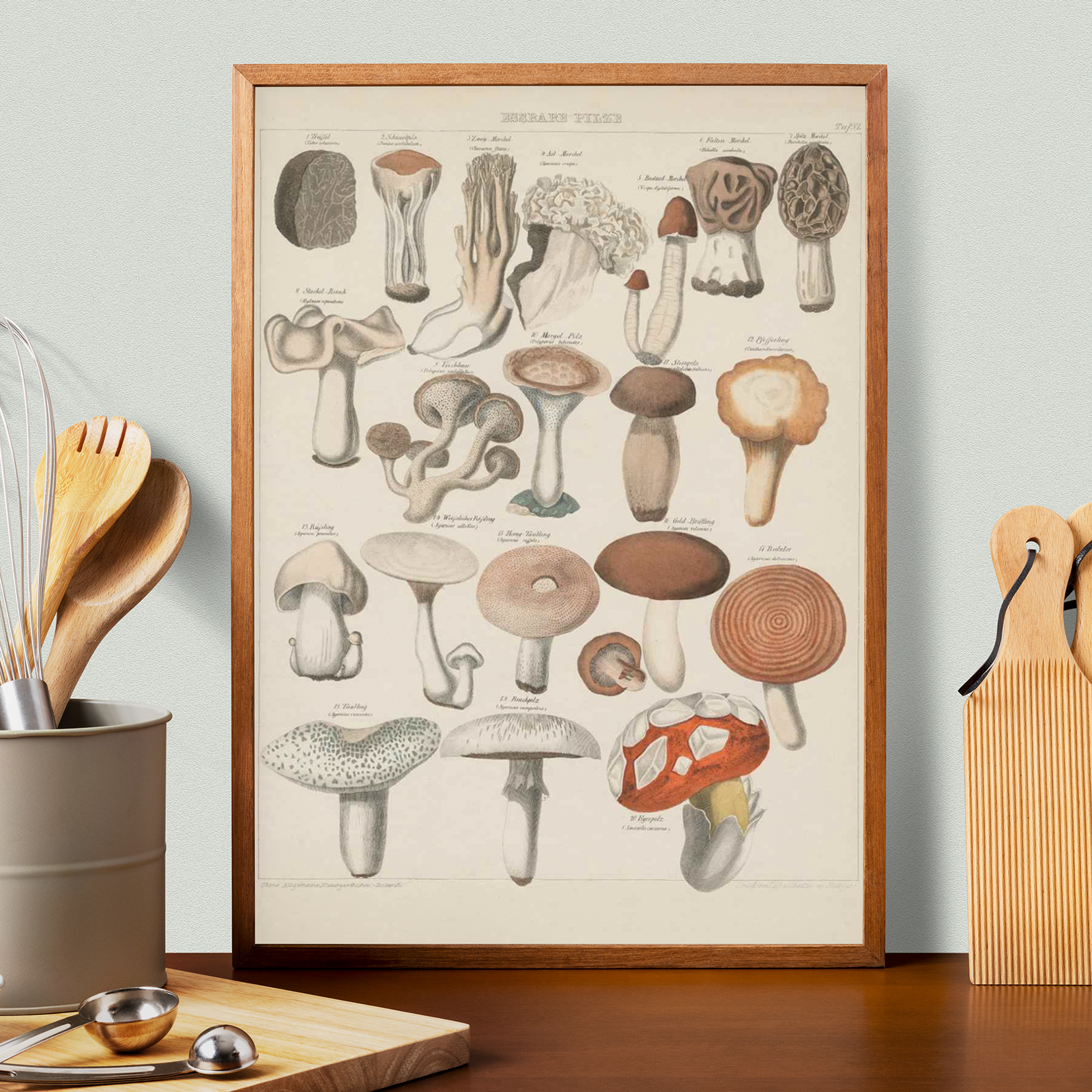 Poster med en gammaldags, vetenskaplig illustrationen Oken Naturalia skapad av den tyske naturvetenskapsmannen Lorenz Oken. I bilden ser vi olika typer av ätbara svampar - kantarell, toppmurkla, karljohan, ängschampinjon med flera.