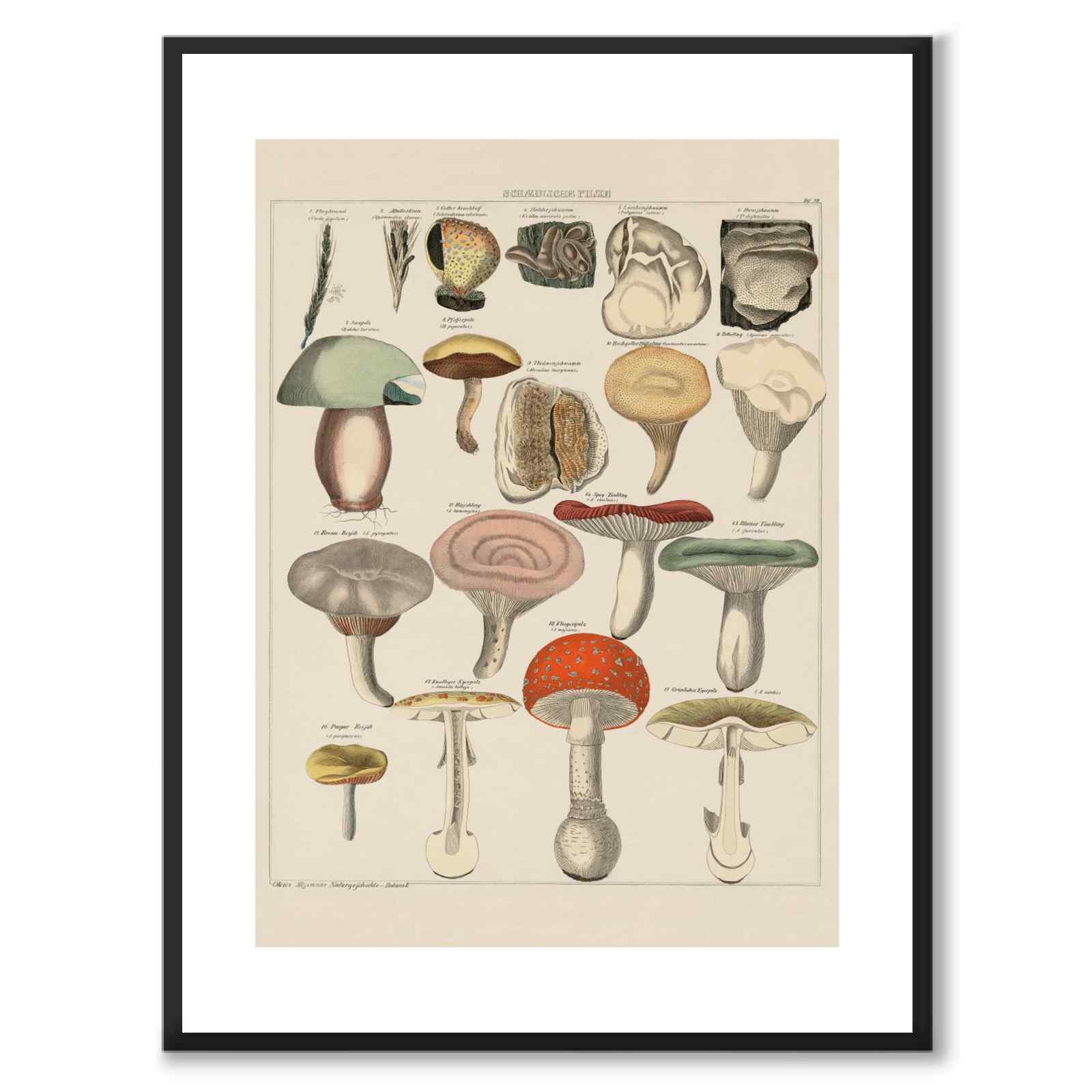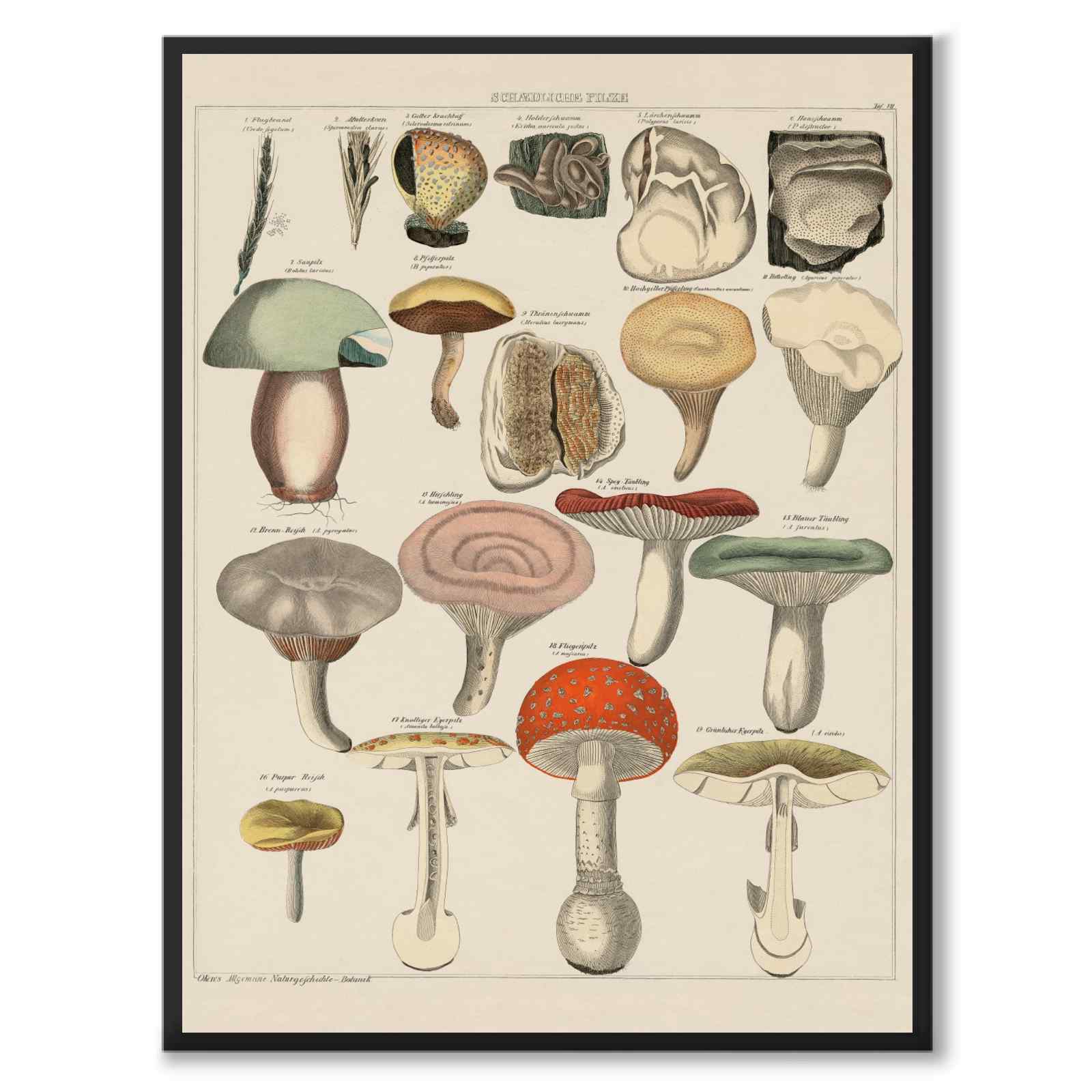 Poster med en gammaldags, vetenskaplig illustrationen Oken Naturalia skapad av den tyske naturvetenskapsmannen Lorenz Oken. Överst på bilden står det SCHÄDLICHE GIFT-PILZE vilket är tyska och betyder "Skadliga och giftiga svampar". Under ser vi flera olika sorters svampar, bland annat olika flugsvampar, djävulssopp och stenmurkla.