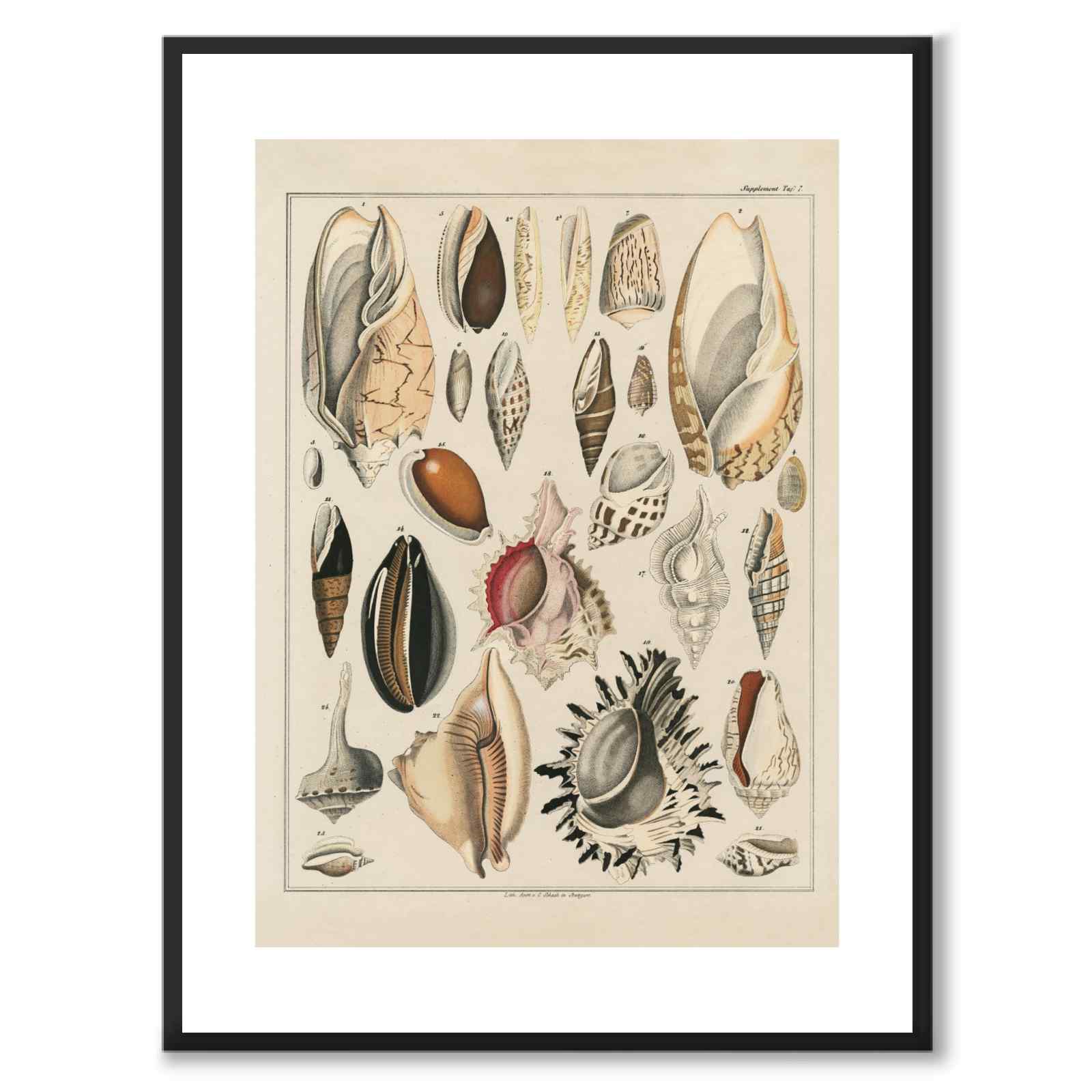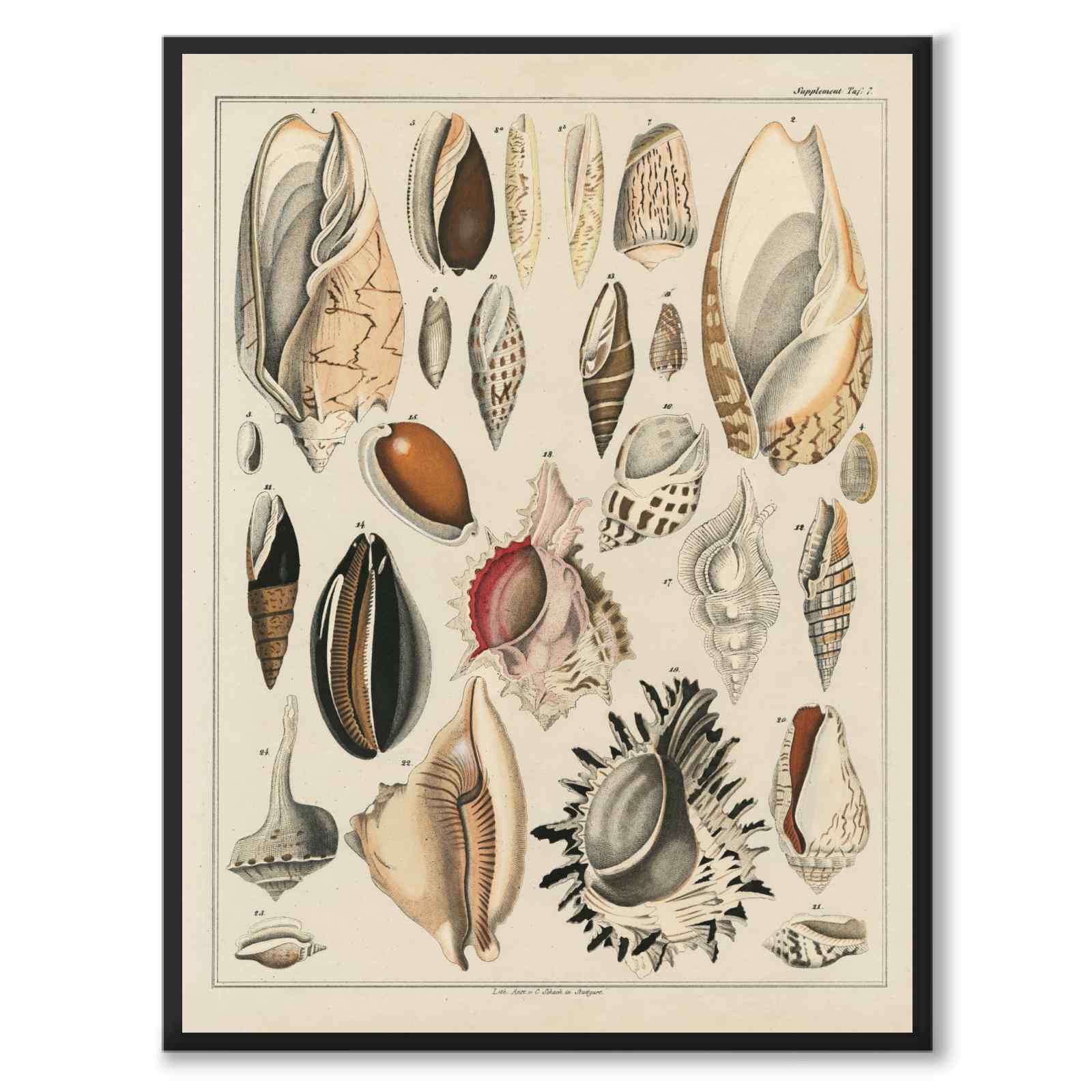 Poster med en klassisk vetenskaplig illustration Oken Naturalia skapad av den tyske naturvetenskapsmannen Lorenz Oken. I bilden ser vi olika typer av vackra snäckor.