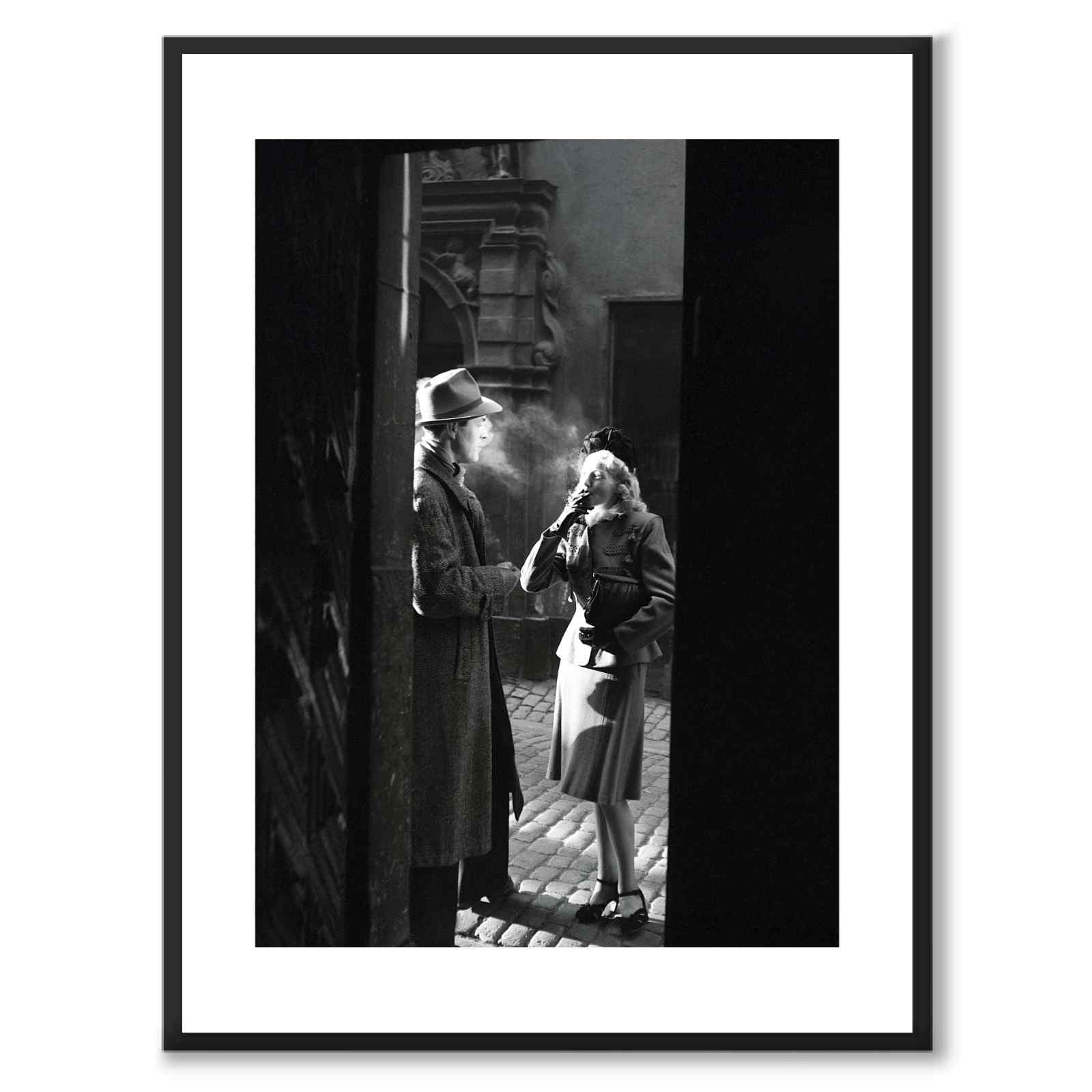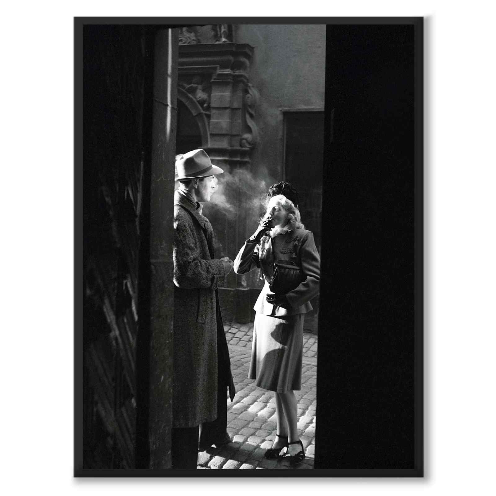 Poster med en gammal bild från Gamla Stan i Stockholm år 1946. Skådespelarna Karl-Arne Holmsten och Irene Söderblom röker mellan inspelningarna av den svenska långfilmen Hotell Kåkbrinken som hade premiär i december samma år. Solen är på väg ned vilket skapar effektfulla ljuskontraster. Skådespelarna är klädda i tidstypiska 40-talskläder.