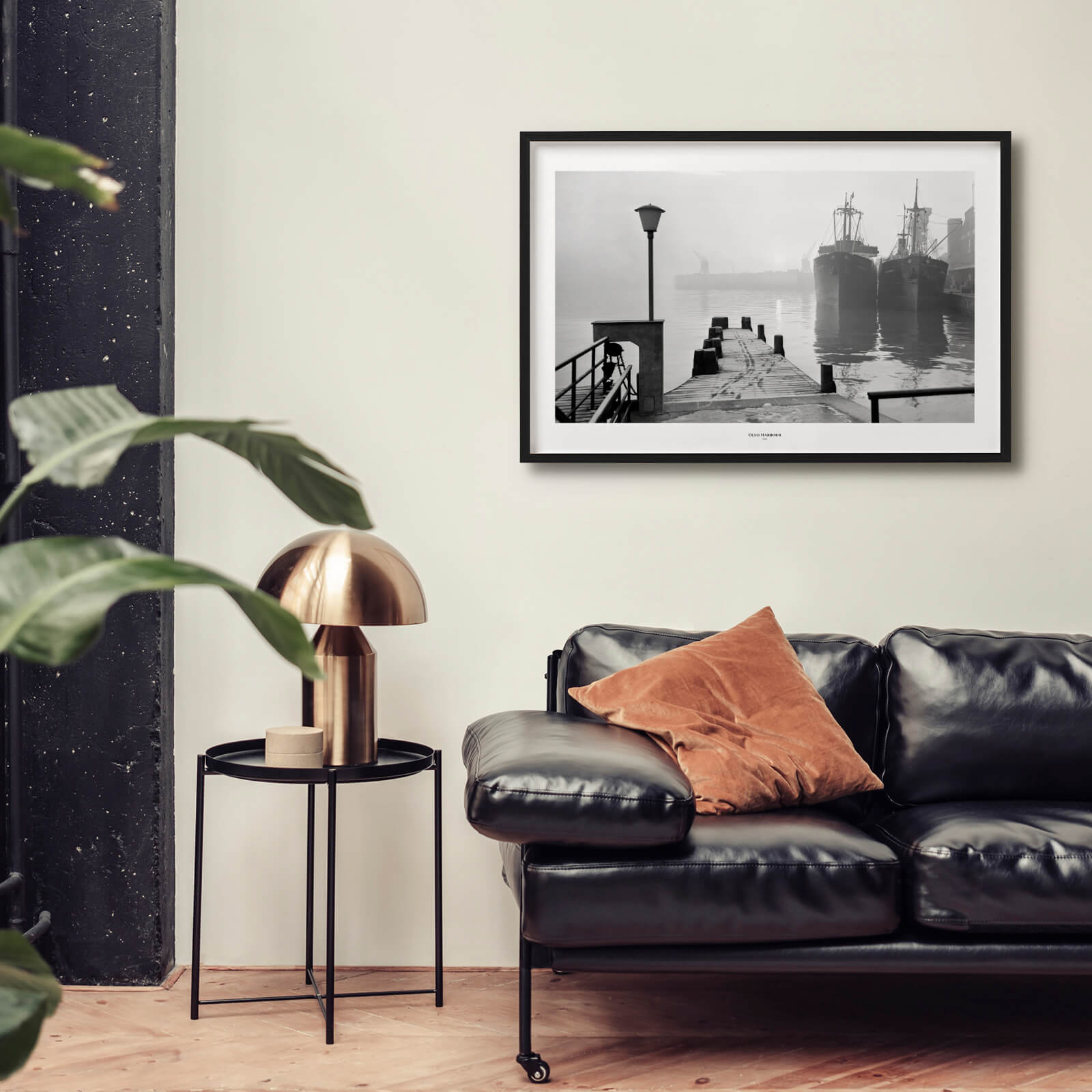 Poster med en stämningsfull bild från Oslo Hamn år 1950. Dimman ligger tät över hamnen och ett tunt lager snö ligger på marken. Två fartyg ligger förtöjda vid kajen - Stamsund och SS Hestmanden.