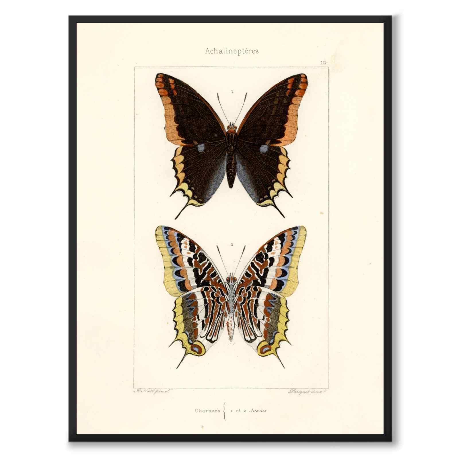 På denna illustration visas två stycken fjärilar från familjen Achalinoptéres. Fjärilarna har stora vingar, och den nedersta fjärilen har många olika nyanser av färgerna gult, blått, och rött.
