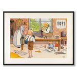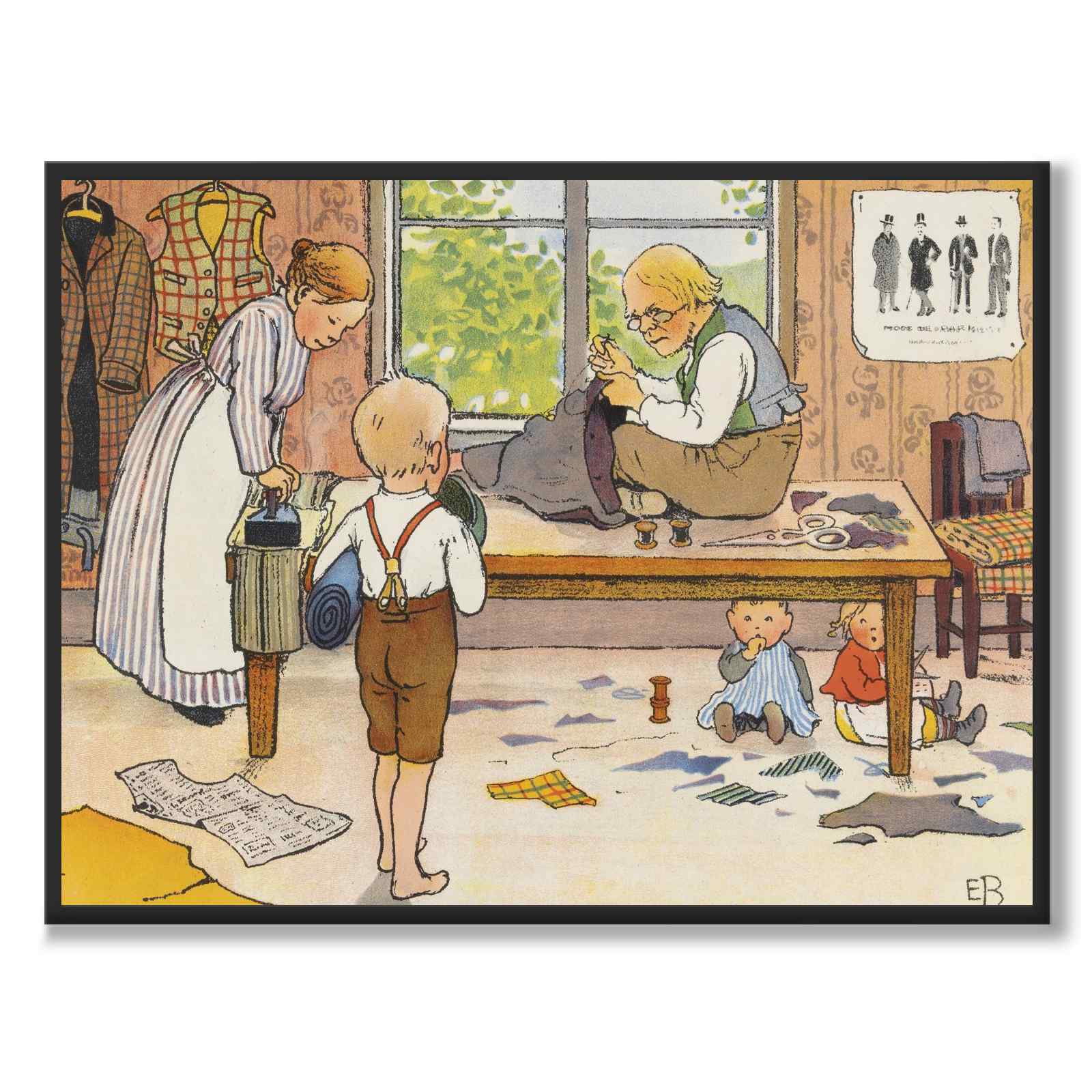 Bilden visar ett livligt skrädderi där en äldre skräddare sitter vid arbetsbordet och syr kläder, medan två små barn leker på golvet bland tygbitar och trådrullar. Kläder hänger på väggarna och arbetsredskap ligger framme, vilket förstärker känslan av hantverk och vardagsarbete.