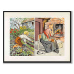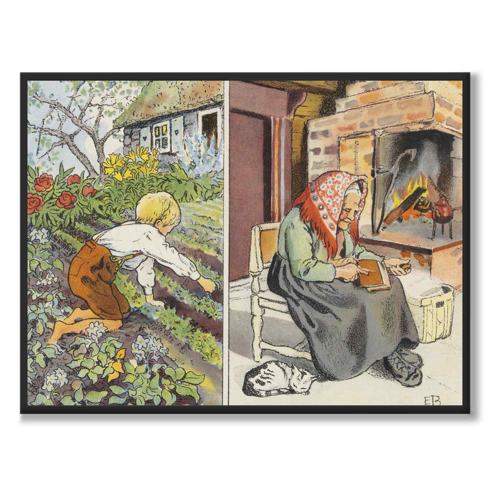 Bilden visar två vardagliga sysslor i ett lantligt hem, uppdelade i två scener. Till vänster arbetar ett barn i trädgårdslandet och rensar bland grönsaker och blommor. Till höger sitter en äldre kvinna inomhus vid den öppna spisen och pysslar med en katt nedanför sig.