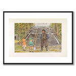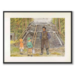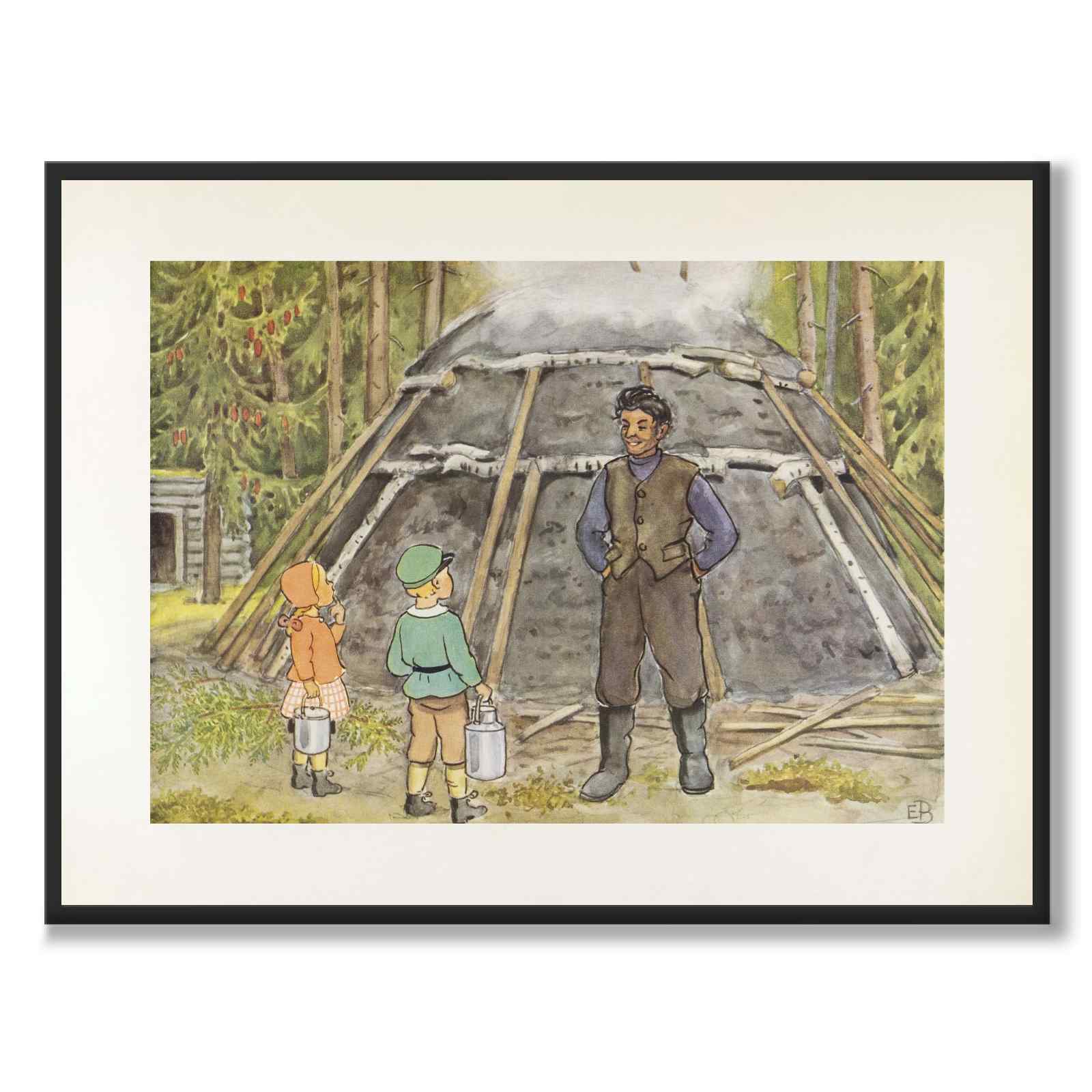 Illustrationen visar två barn som besöker en kolmila djupt inne i skogen. Framför den stora, rykande milan står en kolmilaren, klädd i arbetarkläder och stövlar, redo att ta emot barnen som bär varsin mjölkhämtare. Den stilla skogsmiljön, de höga granarna och röken från kolmilan skapar en lugn och traditionell atmosfär fylld av vinterländsk stämning.