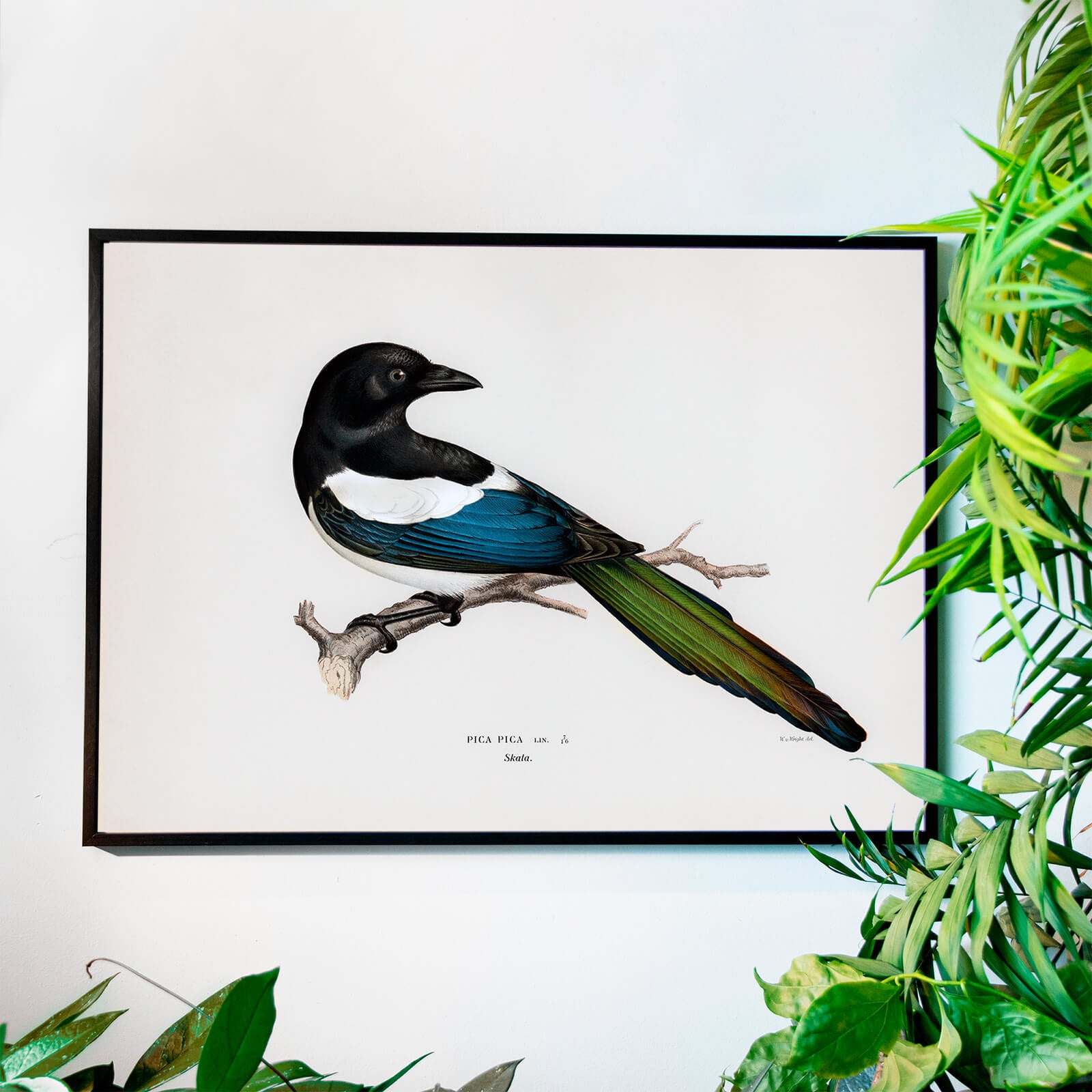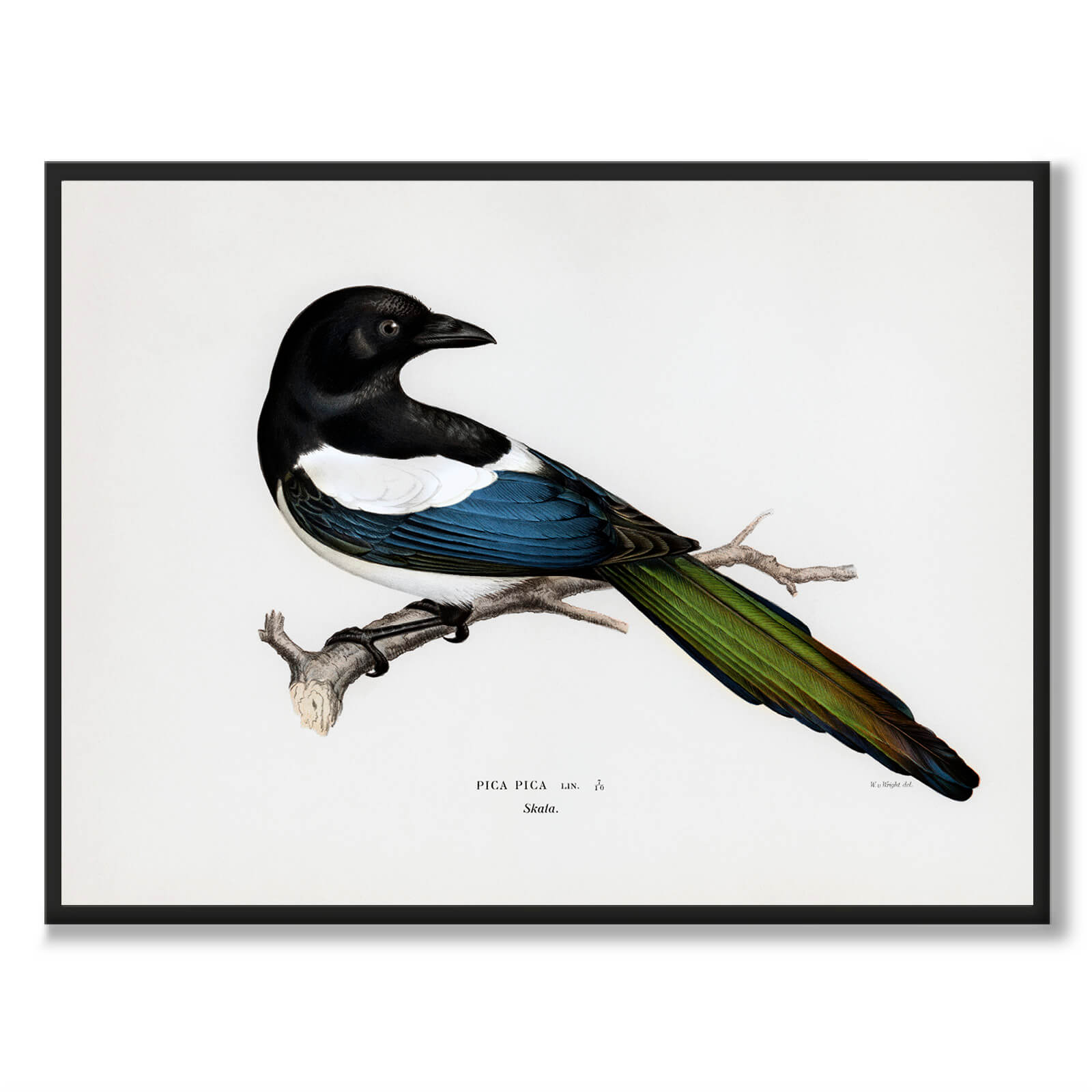 Poster med gammal illustration av en av Europas genom tiderna mest fruktade och inflytelserika fågel - skatan. På bilden kan vi läsa Pica Pica, latin för fågelarten och den publicerades i boken Svenska Fåglar Efter Naturen år 1929.