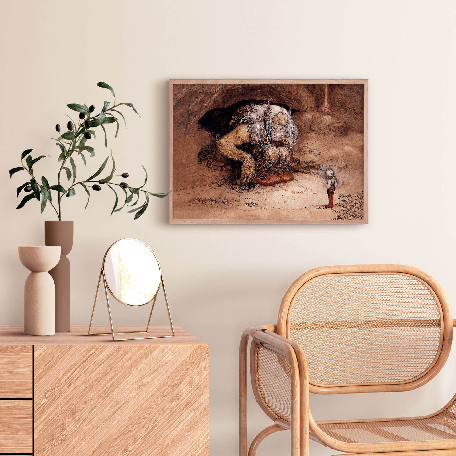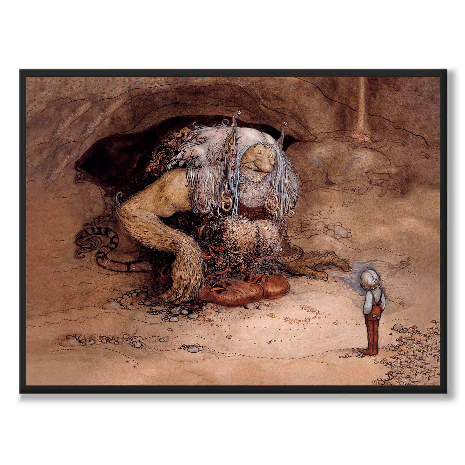 I bilden ser vi ett stort troll på huk i skogen utanför sin håla och framför en modig liten pojke. ”Nej sicken liten puttefnasker!” ropade trollet girigt.