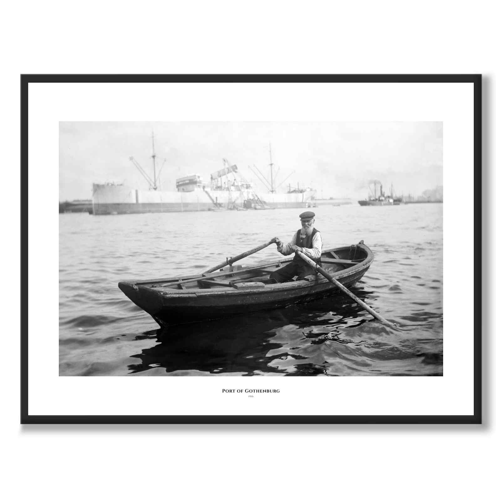 Året är 1916 och på bilden ser vi en äldre man i en roddbåt i Göteborgs hamn. När fotot togs var mannen, som hette Lars Svensson, 77 år gammal.