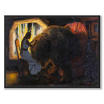 Målningen skildrar en mystisk scen där prinsessan sitter på en stol i ett mörk rum och borstar trollets hår. Trollets stora, skuggiga figurer framträder i kontrast till ljuset från fönstret, vilket skapar en magisk och mystisk stämning.