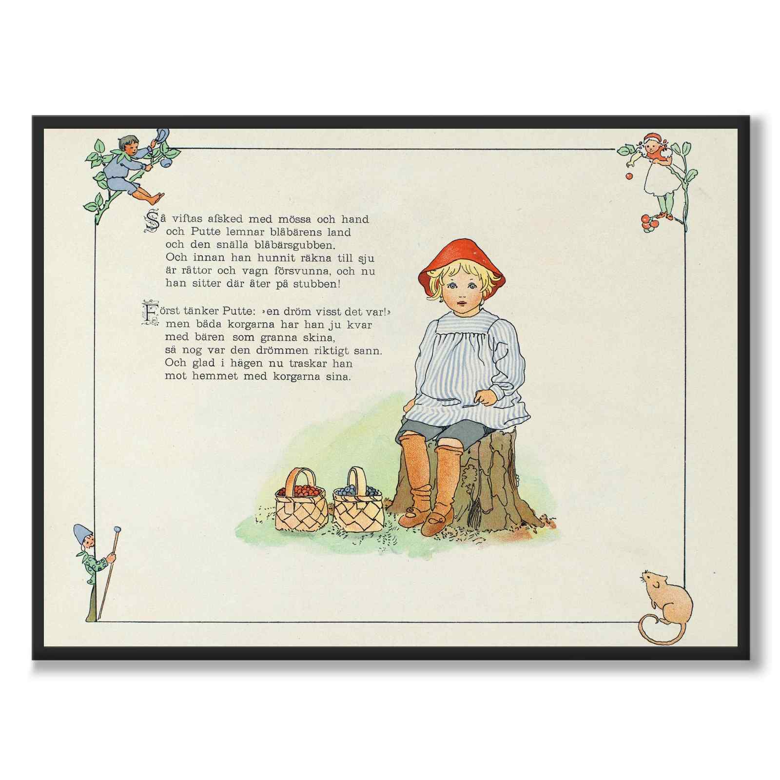 Poster med en illustration ur Puttes äfventyr i blåbärsskogen, en älskad svensk barnbok skriven och illustrerad av Elsa Beskow, från år 1901. Det är en av Beskows mest kända verk och anses vara en klassiker inom svensk barnlitteratur.