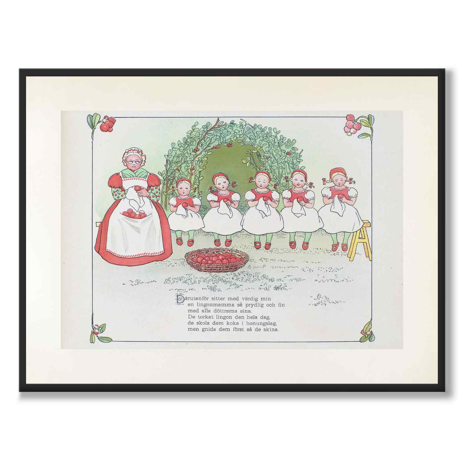 I det här motivet ser vi lingonmamman och hennes döttrar. Under dem ser vi texten: