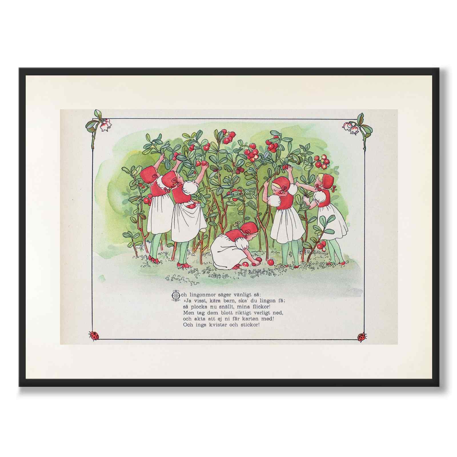I det här motivet ser vi när lingonmammans döttrar hjälper Putte att plocka lingon. Under dem ser vi texten: