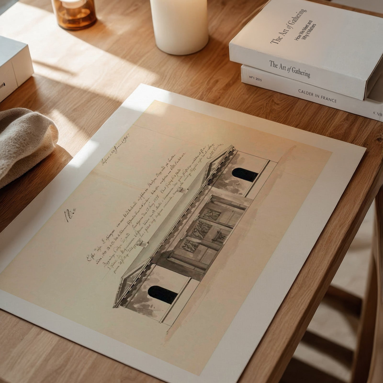 Postern visar en ritning över ett tempelliknande lusthus på Regeringsgatan i Stockholm är 1795, designat av arkitekten Per Estenberg. Estenberg var en framstående svensk arkitekt som hade arbetat under elva år som elev hos den franske arkitekten Louis Jean Deprez, vilket påverkade hans design och stil.