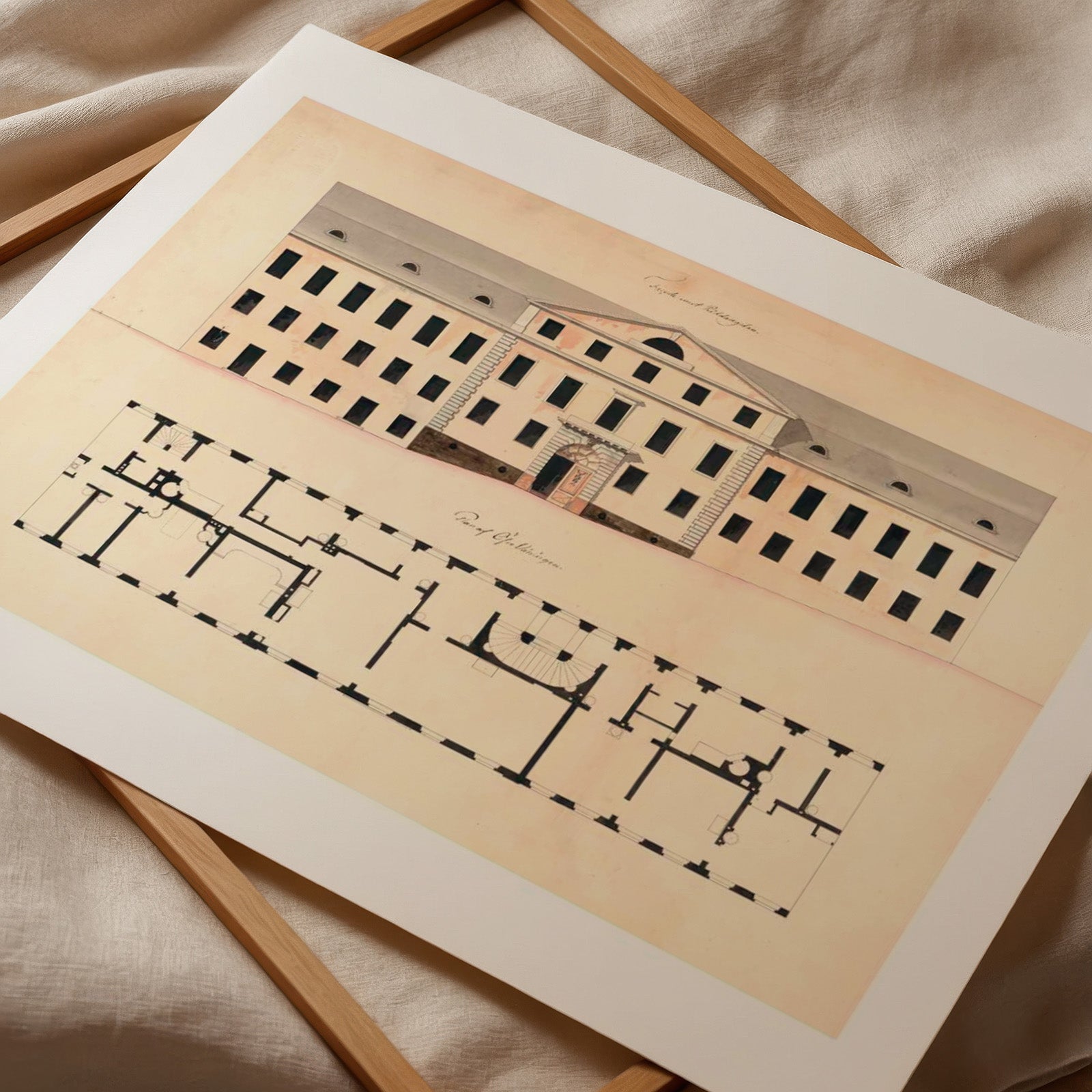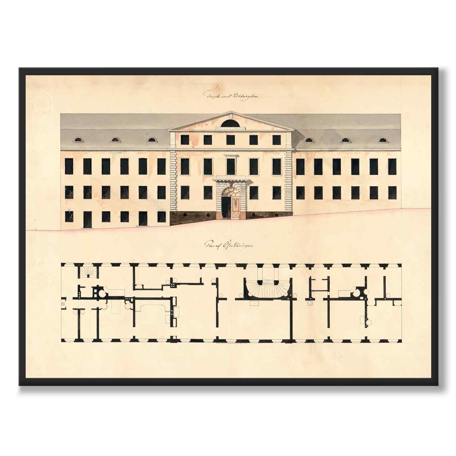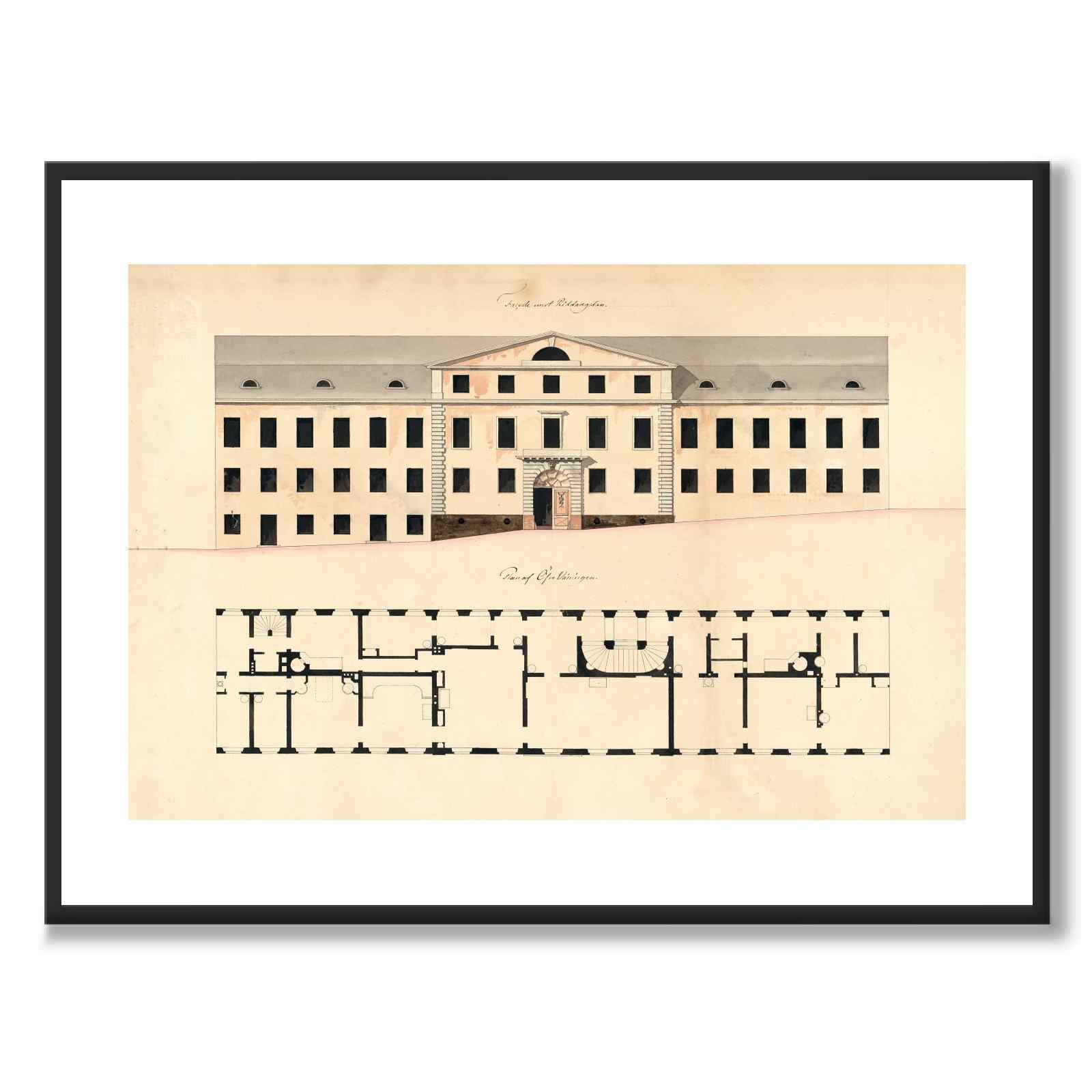 Poster med en ritning för en tomt på Riddargatan i Stockholm, 1805 av Carl Schenbeck. Schenbeck var en framstående svensk arkitekt under den neoklassiska perioden, och detta projekt är ett exempel på hans arbete som var influerat av nyantikens och empirens ideal.