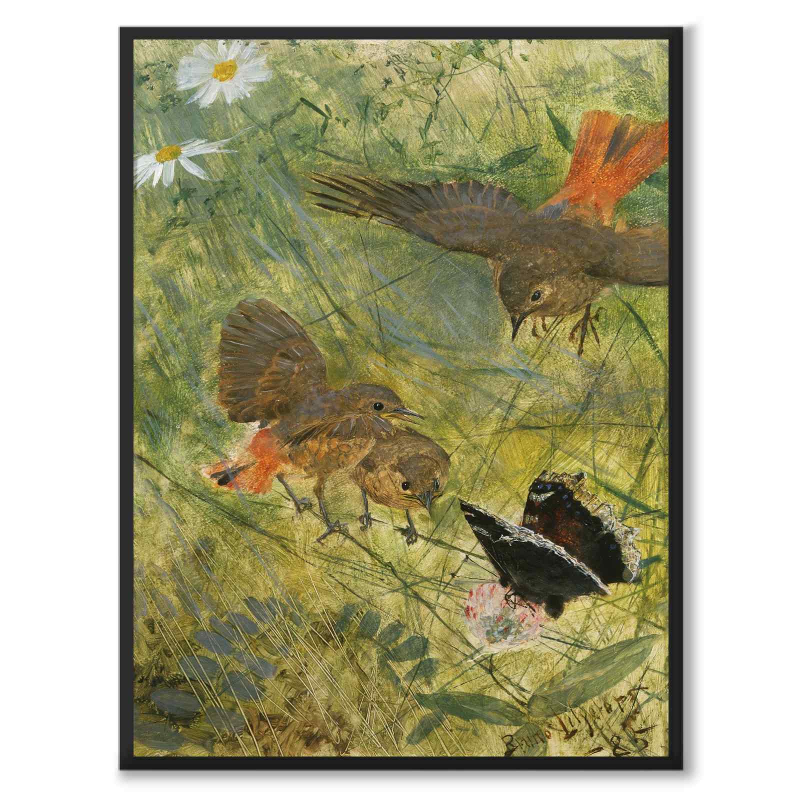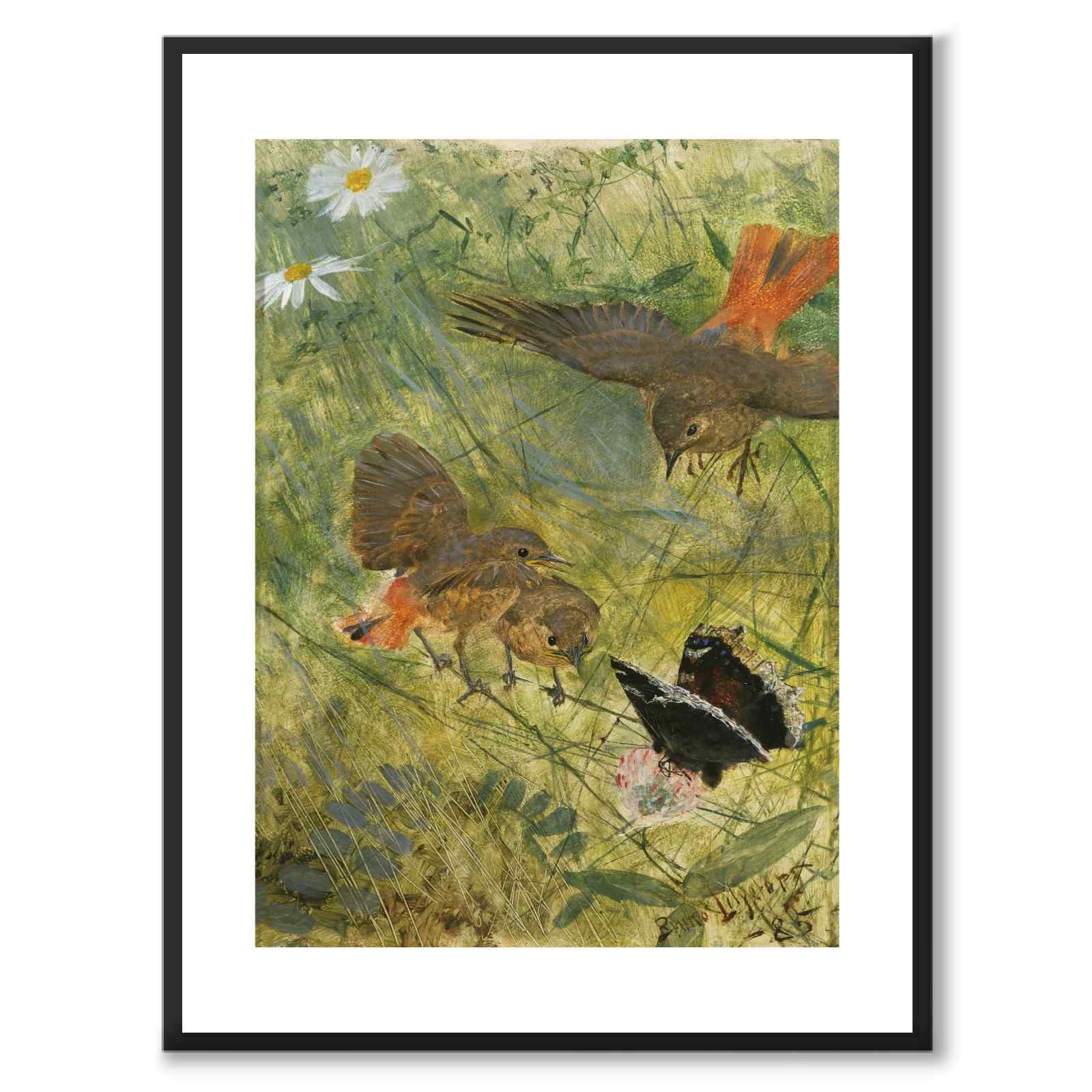 Poster med målningen Rödstjärtar och fjäril av Bruno Liljefors från år 1885.