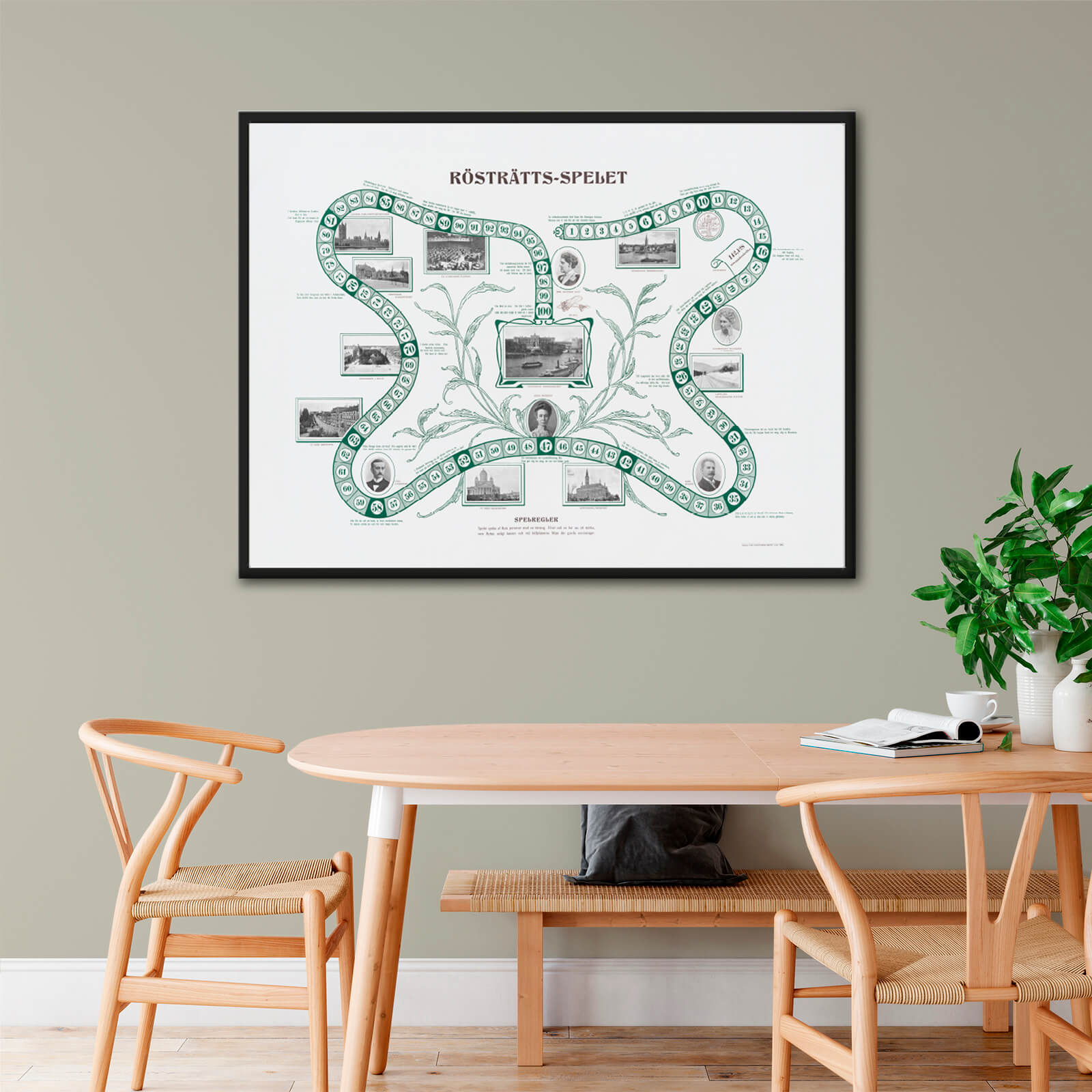 Det här motivet heter Rösträtts-spelet och är en fantastisk och stark illustration som visar kvinnorörelsens resa och framsteg i början av 1900-talet. Rösträtts-spelet föreställer ett tärningsspel och delades ut som vykort år 1910 för att propagera för kvinnors jämställdhet och rösträtt.