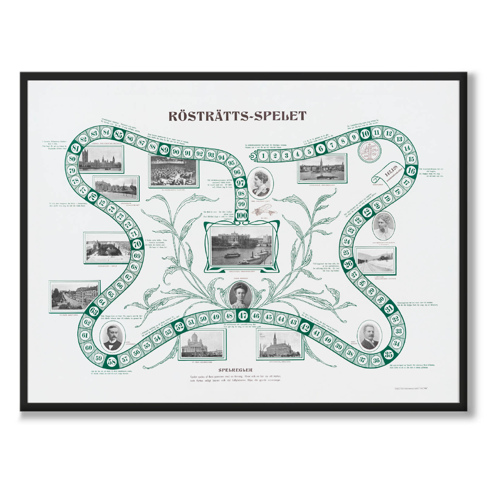 Det var Föreningen för kvinnors politiska rösträtt (F. K. P. R.) och Landsföreningen för kvinnors politiska rösträtt (L. K. P. R.) som stod bakom rösträtts-spelet. På bilden ser vi porträtt av Carrie Chapman Catt, Ann Margret Holmgren, Karl Staaf, Signe Bergman och Carl Lindhagen samt vyer från städer och platser där frågor kring kvinnans rösträtt varit aktuell.