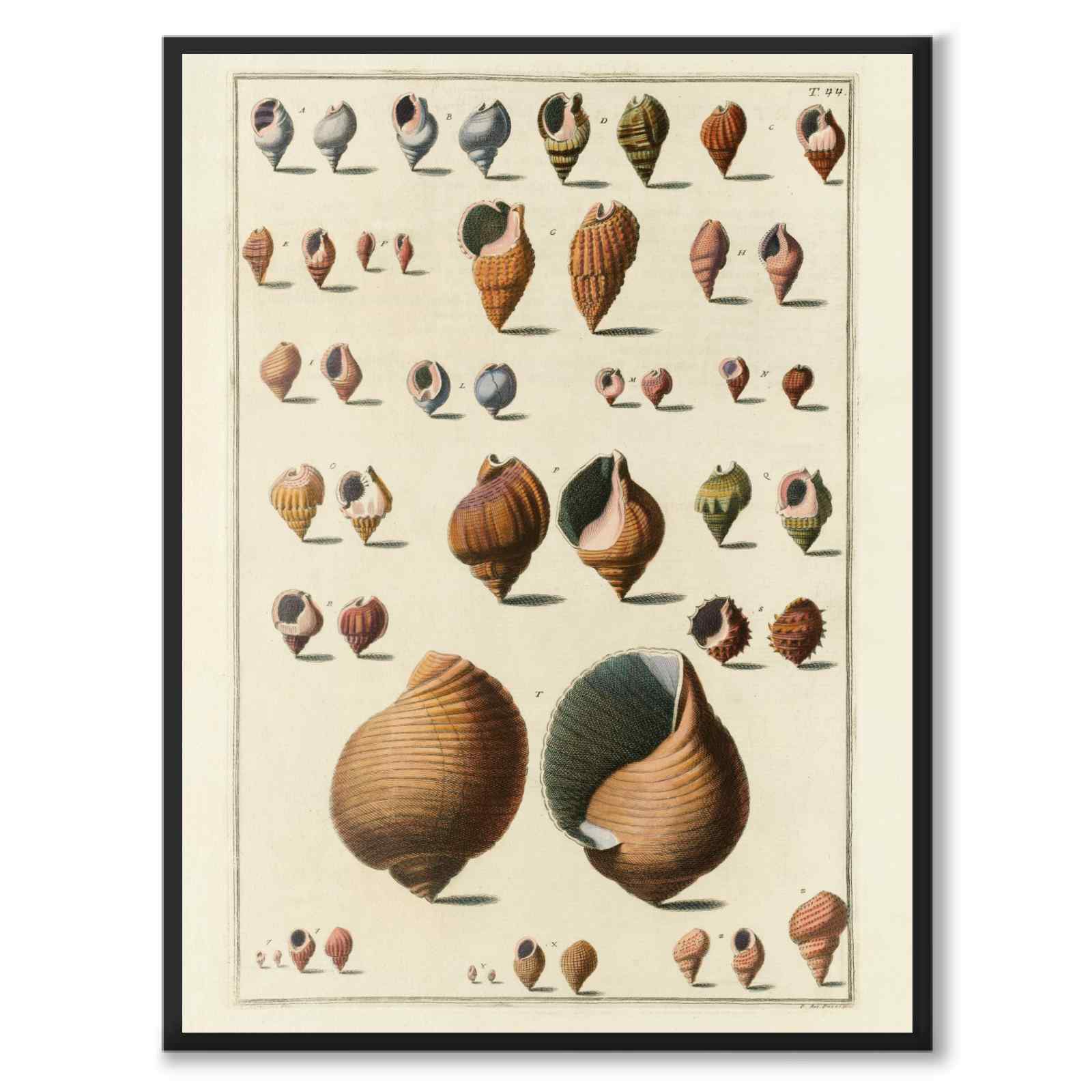 Poster med en vacker karta av olika snäckor från 1800-talet. Ett tjugotal snäcksorter illustreras framifrån och bakifrån med tillhörande numrering.