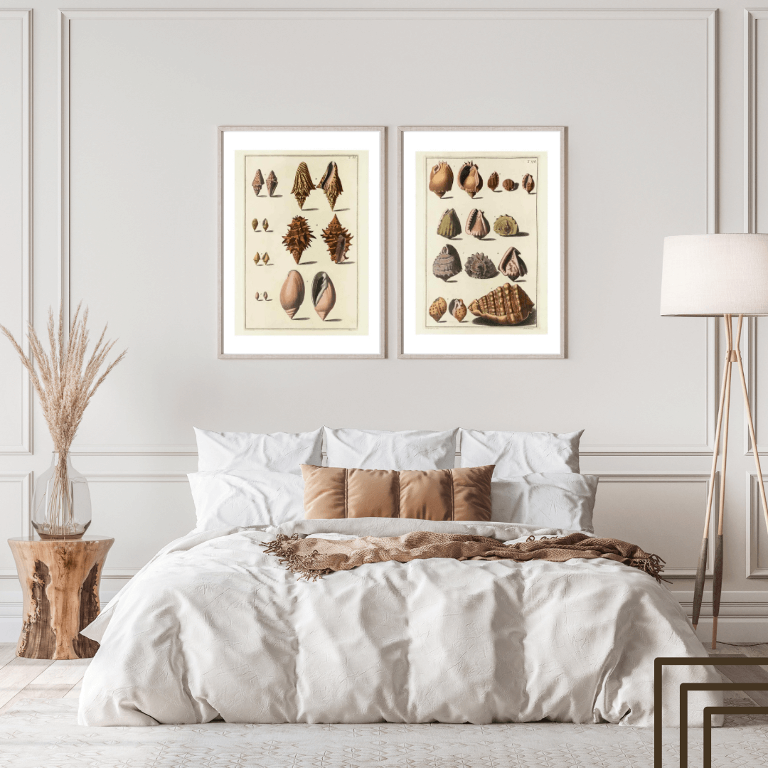 Poster med en vacker karta av olika snäckor från 1800-talet. Ett halvt dussin snäcksorter illustreras framifrån och bakifrån med tillhörande numrering.