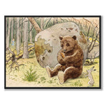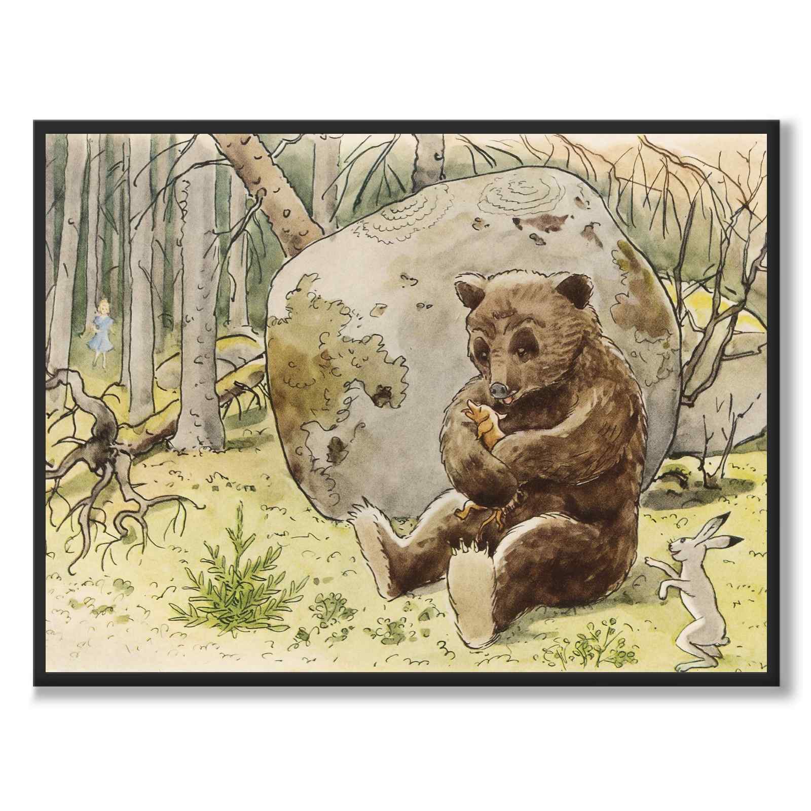 Bilden visar en scen där en björn sitter lutad mot ett stort stenblock i skogen och håller något i sina tassar. En hare står försiktigt framför honom och verkar nyfiket närma sig. I bakgrunden skymtar en liten prinsessa mellan träden.