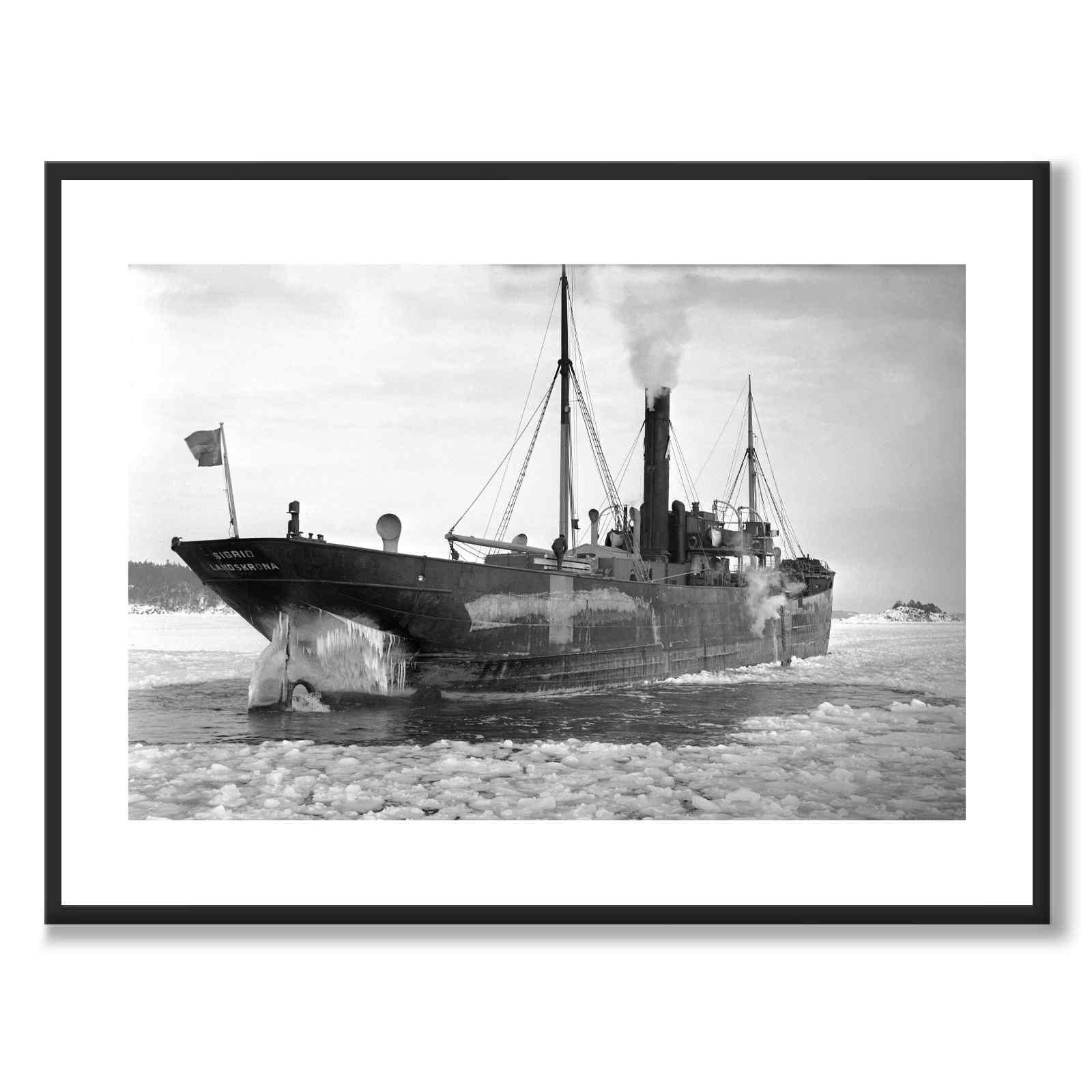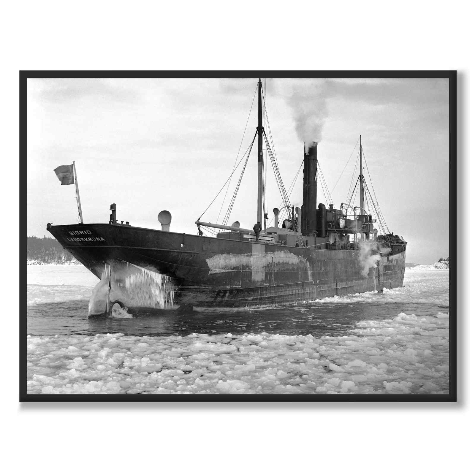 Poster med en bild på lastfartyget Sigrid av Landskrona som ligger infruset i Stockholms södra skärgård. Fartygets motorer körs och propellern snurrar för att göra så att det blir isfritt runt skrovet. Bilden är tagen i februari år 1940.