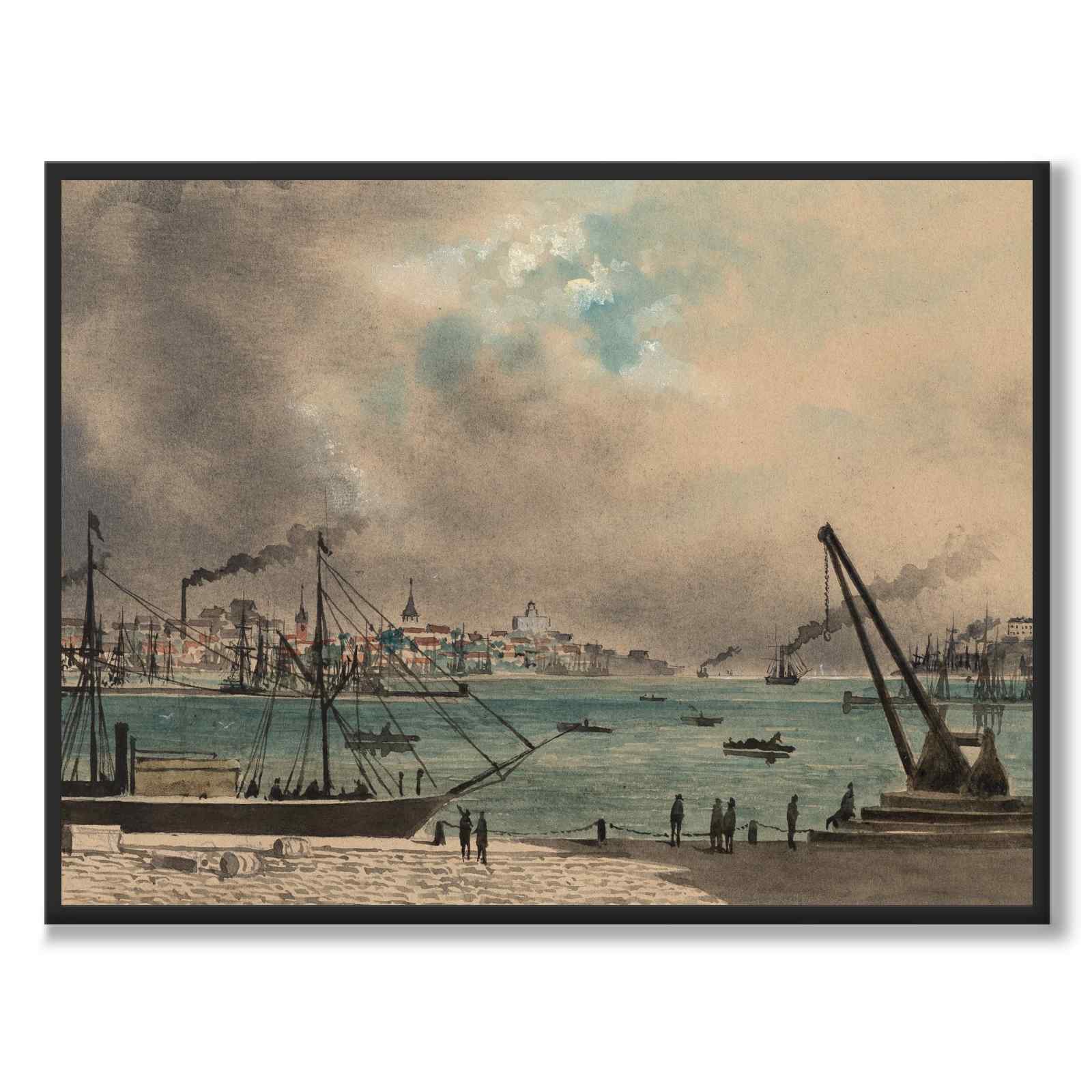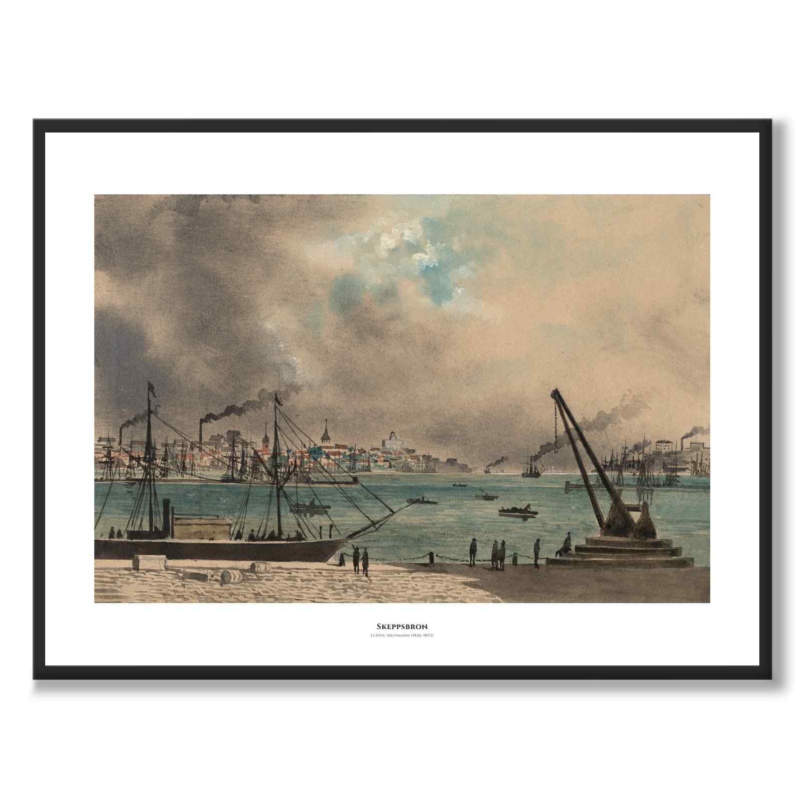 Poster med en vacker målning av Skeppsbron från Hisingssidan i Göteborg. Konstverket är skapat av den danske konstnären Ludvig Messmann år 1890 och är en del av en hel serie med vackra Göteborgsmotiv.