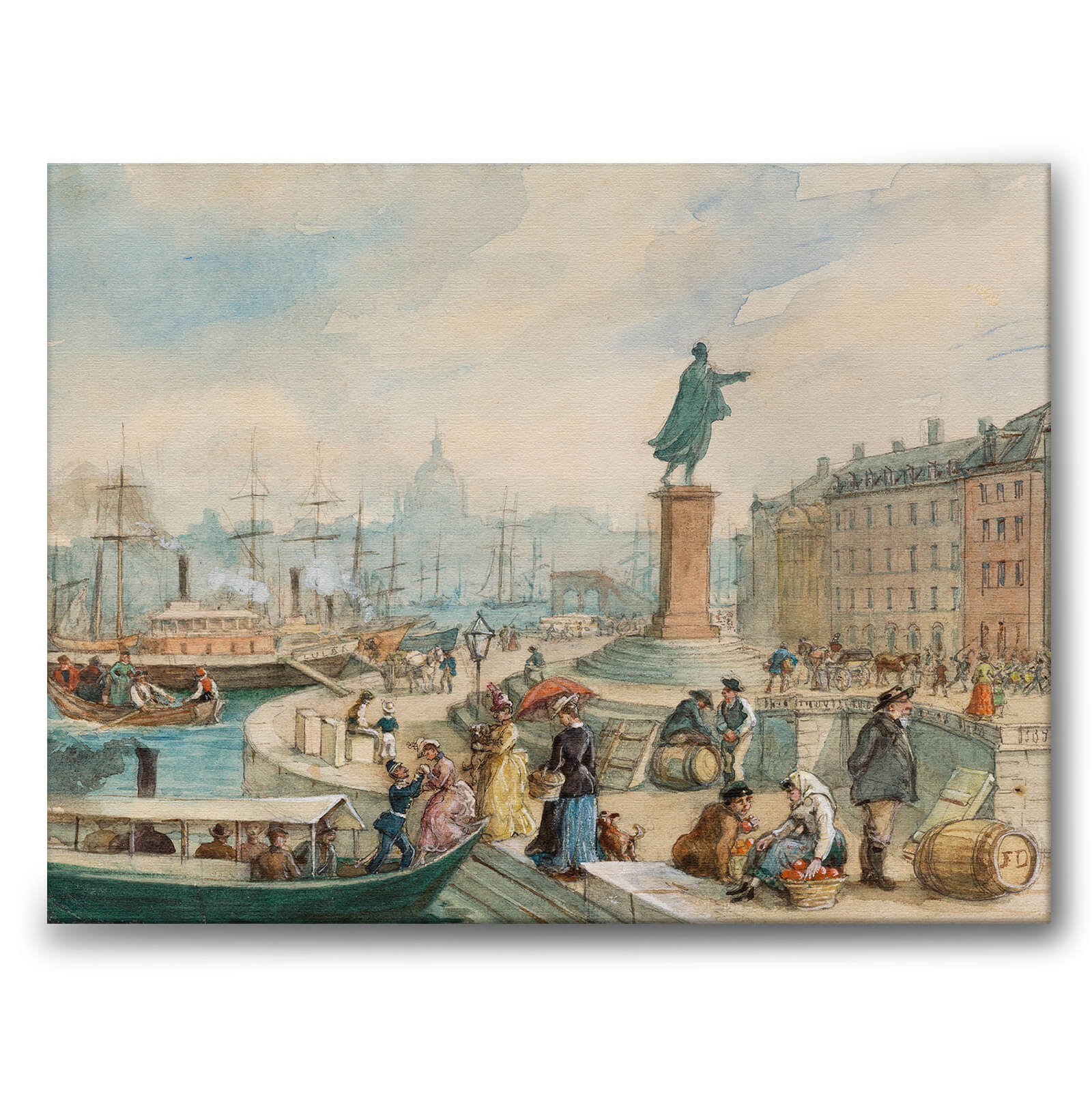Canvas med en vacker målning från 1860-talet av Fritz Von Dardel, en svensk överintendent, militär, målare och tecknare. Målningen är av folkliv vid Gustav III:s staty på Skeppsbron i Stockholm.