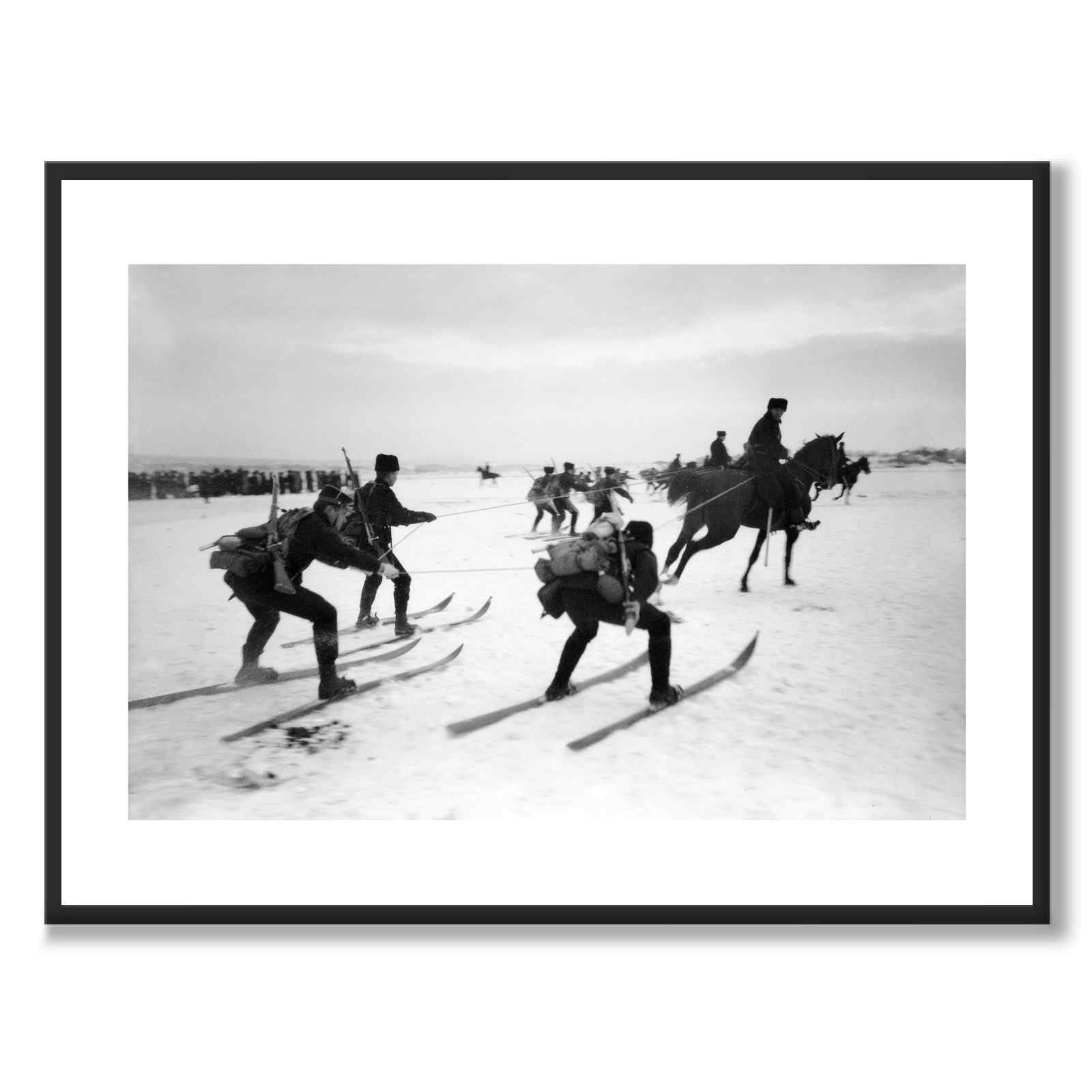 Poster med ett fotografi "Snørekjøring" som fångar en grupp soldater som åker skidor i snön och blir dragna av hästar. Detta är en typisk scen för "snörekörning".