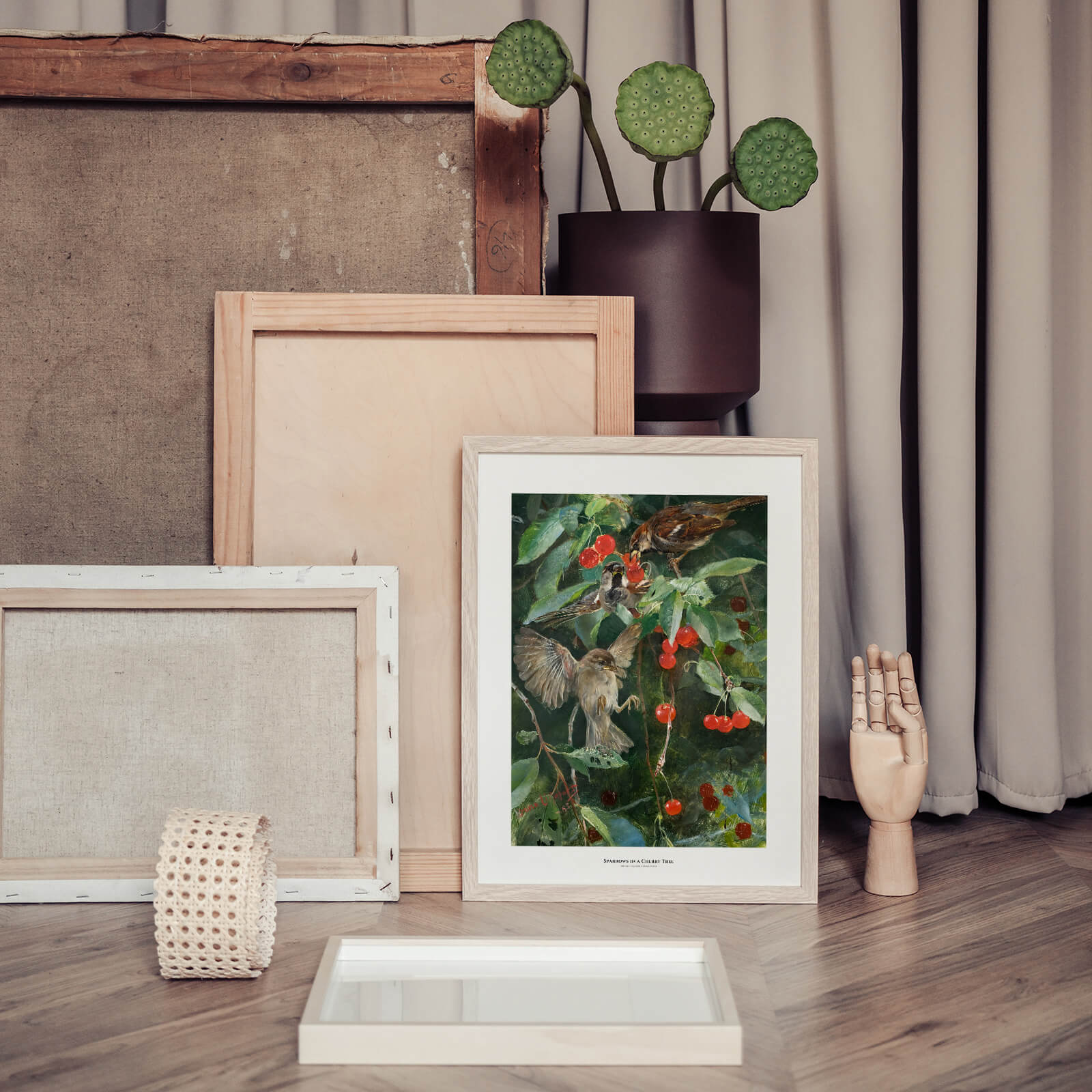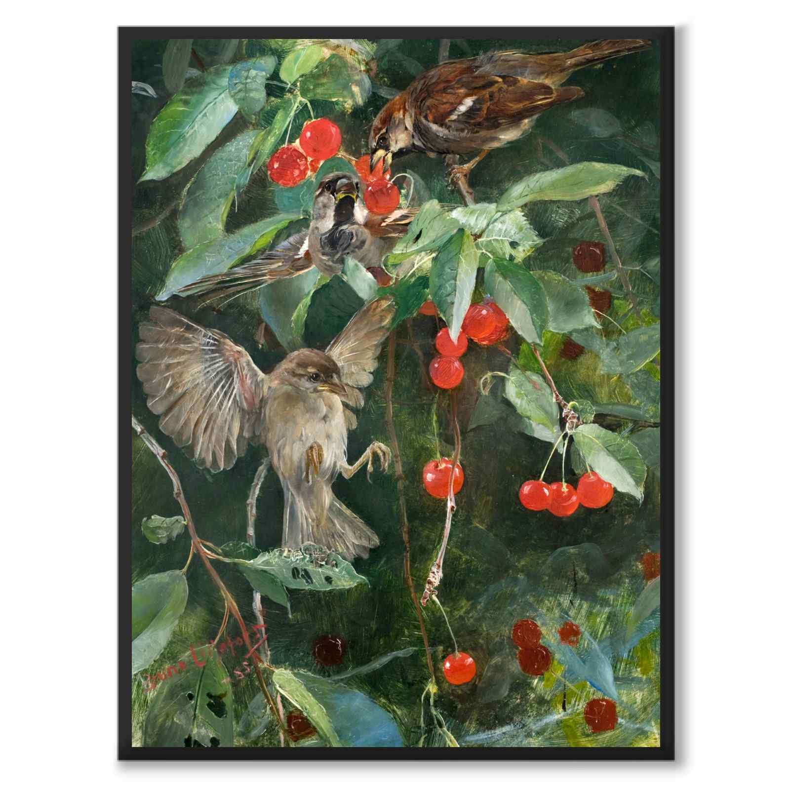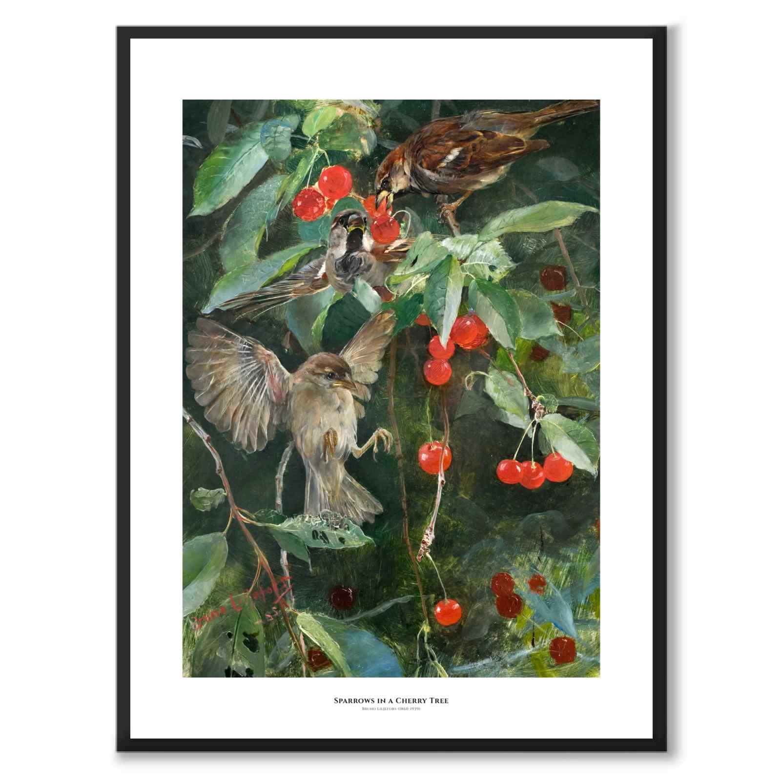 Poster med en målning av Bruno Liljefors föreställande två gråsparvar i ett körsbärsträd.