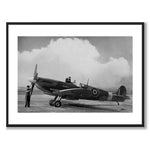 Poster med ett vintage fotografi av två personer som står vid ett flygplan av modellen: Spitfire Mark IX.