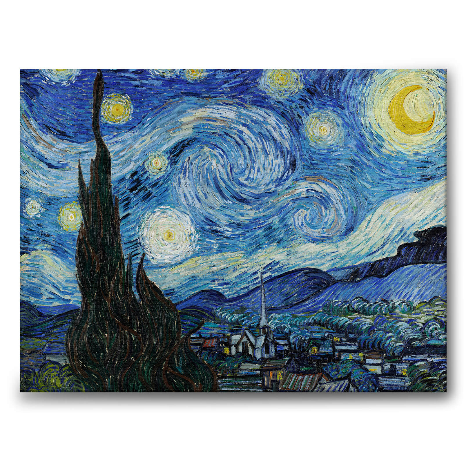 Canvastavla med det världskända motivet The Starry Night från 1889 av den impressionistiska konstnären Vincent van Gogh. Motivet föreställer utsikten från van Goghs fönster i det mentalsjukhus som han var inlagd på efter att ha skadat sig själv året innan.