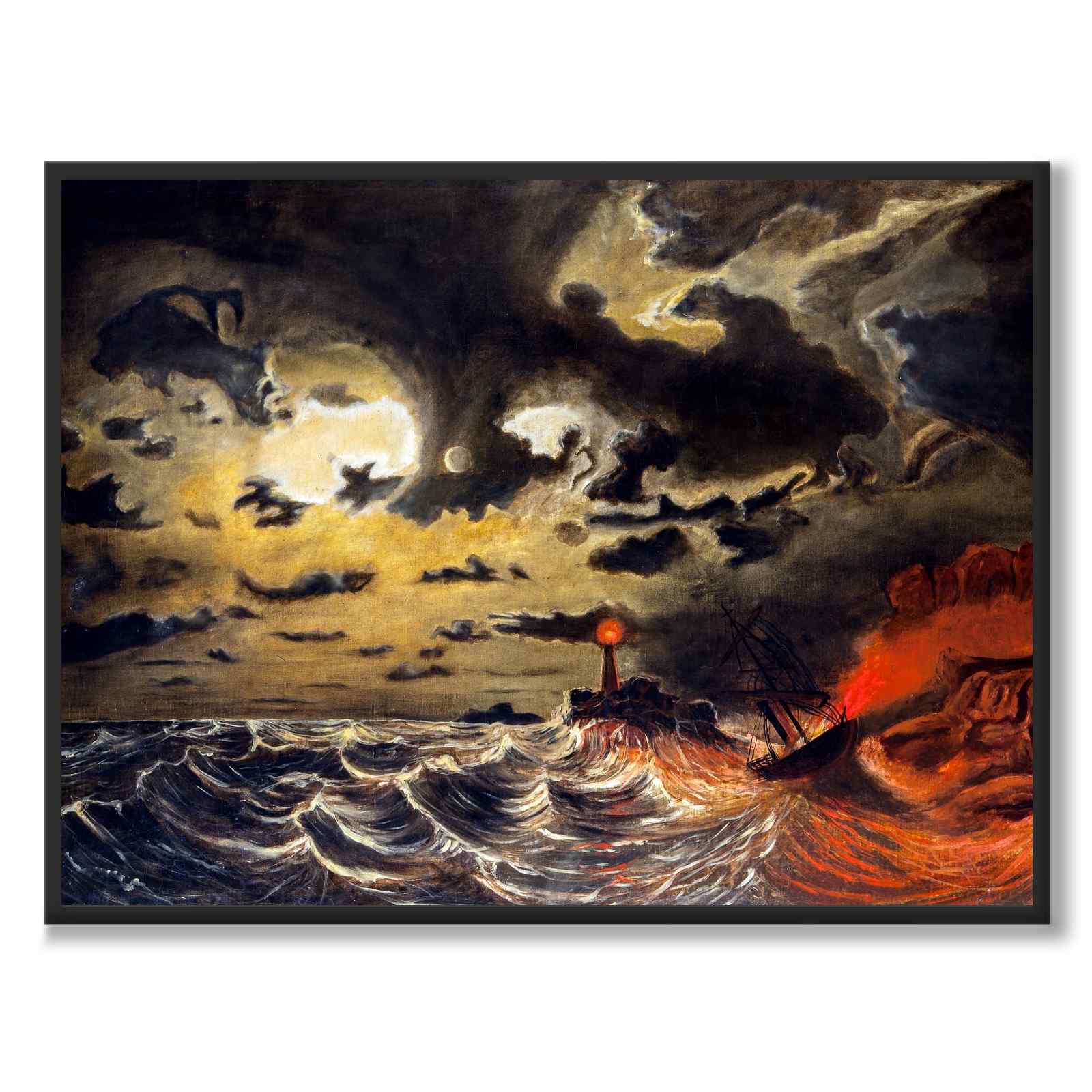 Poster med den vackra målningen Steamer in flames, eller Brinnande ångbåt på svenska. Målningen är skapad under mitten av 1800-talet av Marcus Larson, en svensk målare.
