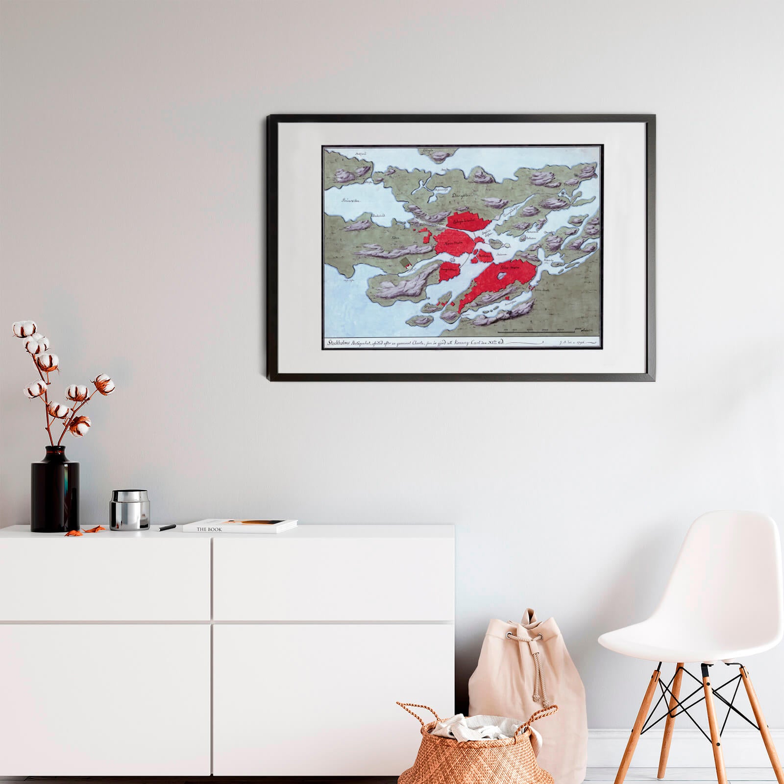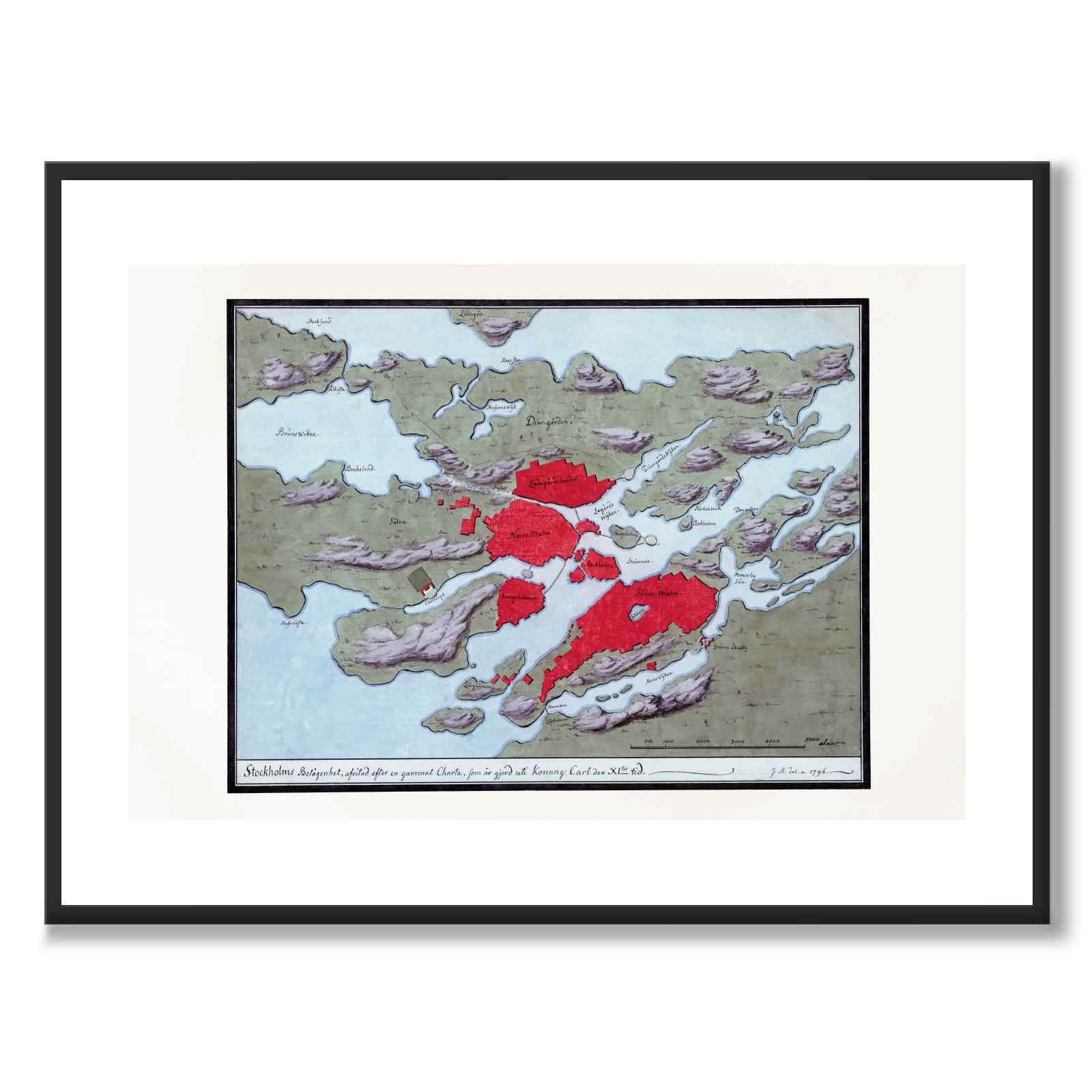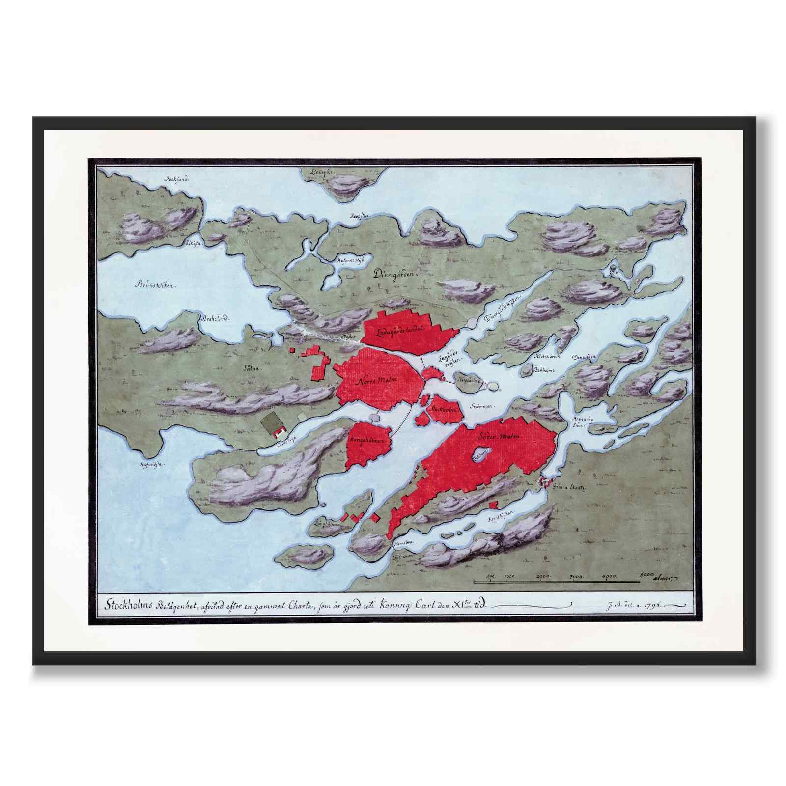 Poster med en gammal karta över Stockholm år 1817. På kartan ser vi bland annat texten "Stockholms belägenhet, afritad efter en gammal charta, som är gjord uti konung Carl den XI.tes tid".