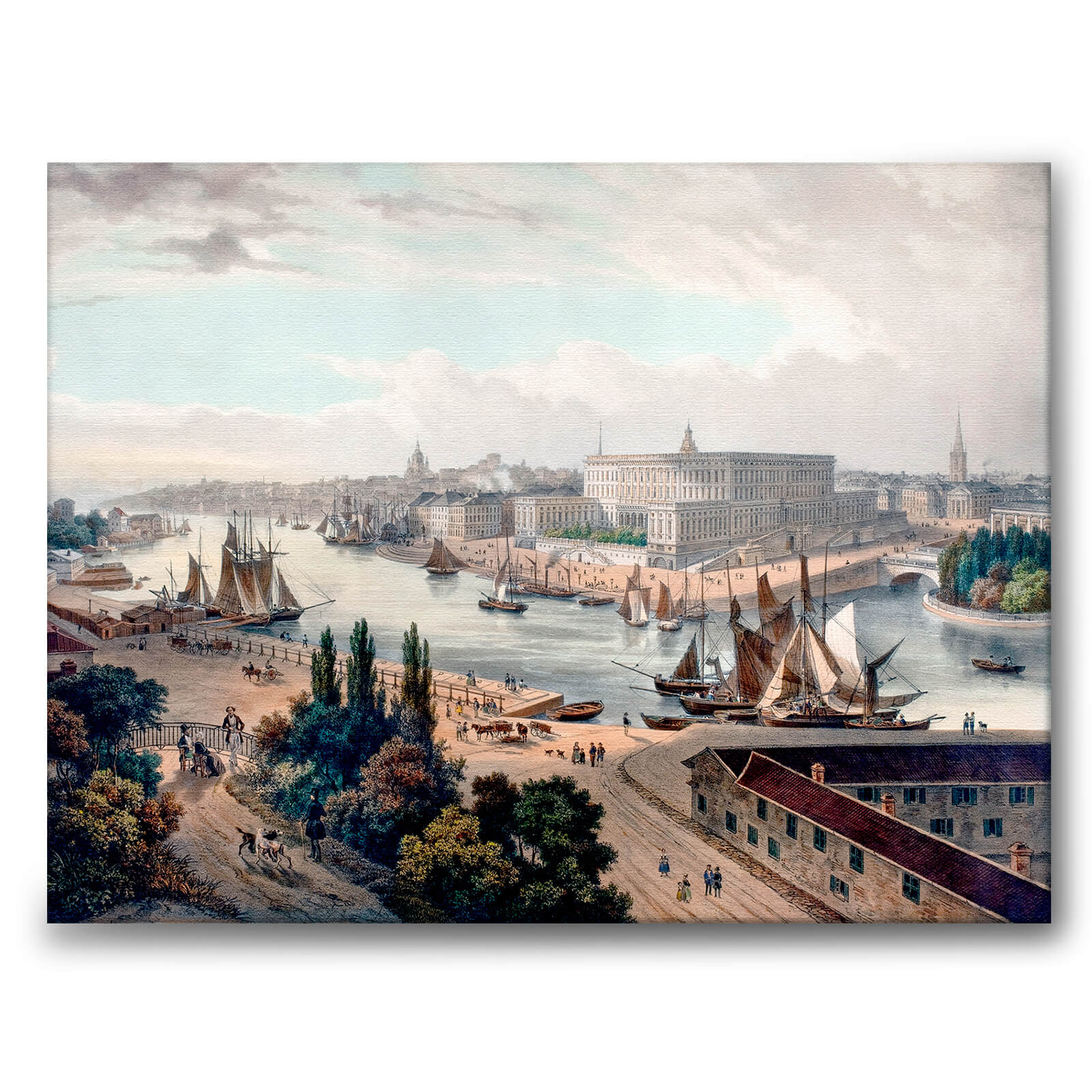 Canvastavla med en målning från 1840-talet med utsikt över slottet, Skeppsbron och Skeppsholmen. Konstnären Johan Henric Strömer har stått och målat tavlan på Fersenska Terassen som ligger mellan Kungsträdgården och Grand Hotel.