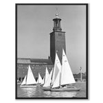 Fotografiet fångar segelbåtar framför Stockholms stadshus under Skolungdomens Stadshusregatta, ett evenemang där unga seglare tävlade i centrala Stockholm. Evenemanget ägde rum i Riddarfjärden, mitt i staden, och speglar både det stora intresset för segling bland ungdomar och en tid då friluftsliv och idrott sågs som en viktig del av folkhemstanken.