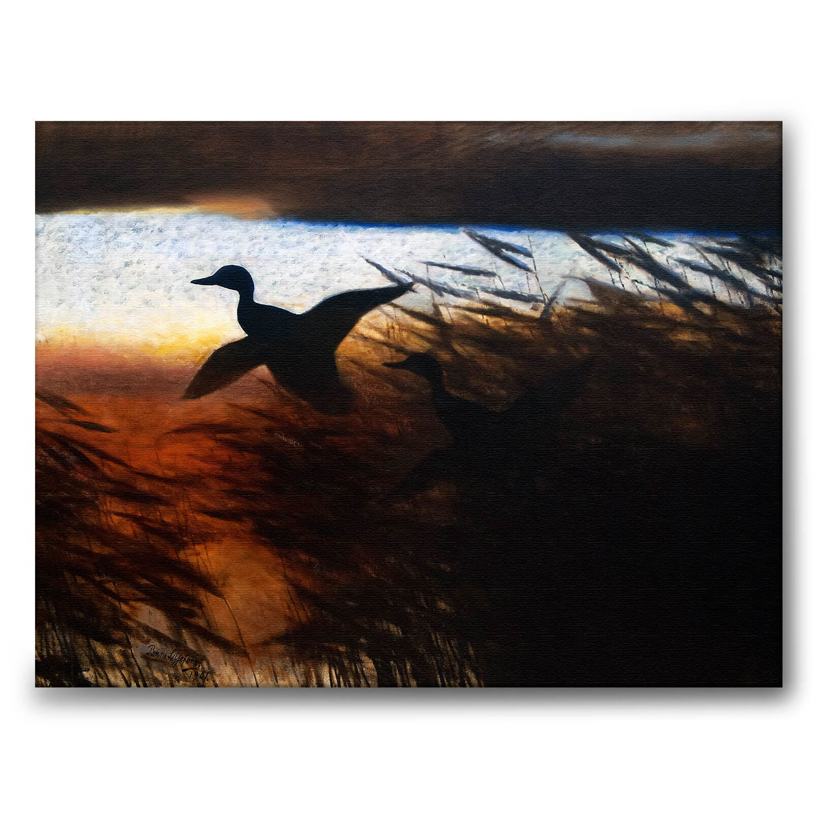 Canvastavla med en vacker målning av Bruno Liljefors från sekelskiftet. På bilden ser vi en and lyfta ut i kvällsluften över en vacker sjö. Man kan se solens sista ljus över vattnet och vinden i vassen. Verket heter Sommarnatt, lyftande änder och målades år 1901.