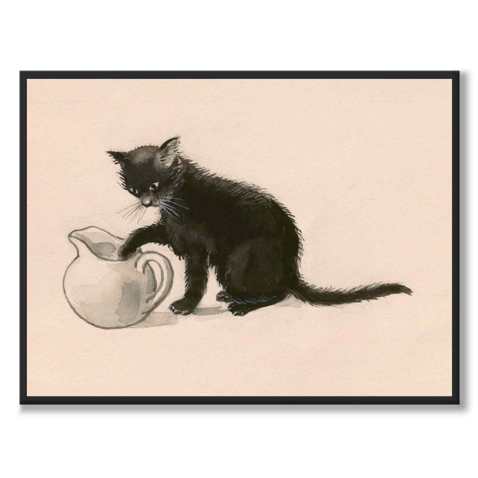 Bilden visar en liten svart kattunge sitter bredvid en kanna och lägger tassen på den, som om den undersöker den nyfiket. Bilden är enkel och stillsam, med katten i fokus mot en ljus bakgrund.