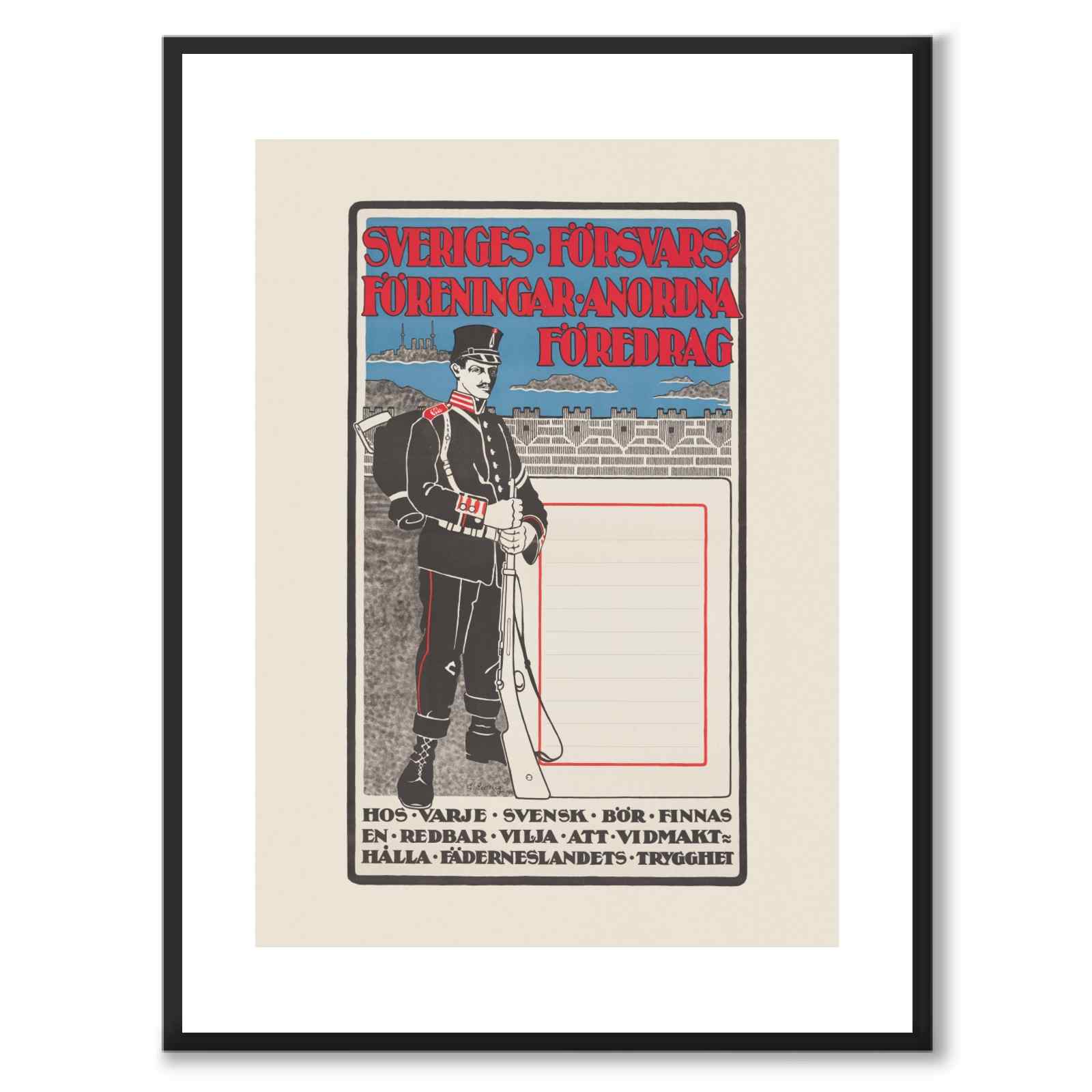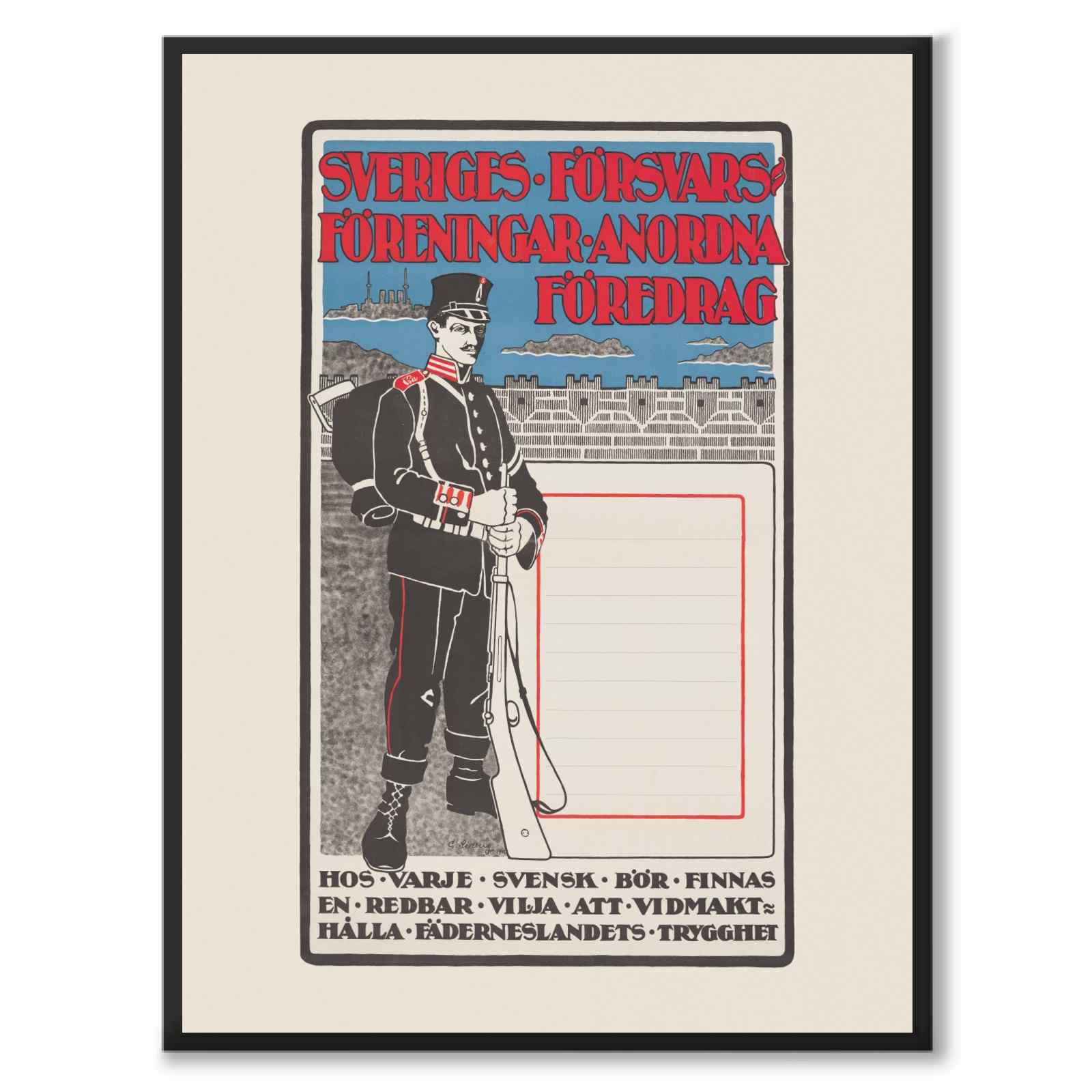 Poster med en affisch om fördrag av Sveriges Försvarsföreningar från 1912. På affischen ser vi texten "Sveriges försvarsföreningar anordna föredrag : Hos varje svensk bör finnas en redbar vilja att vidmakthålla fäderneslandet trygghet".