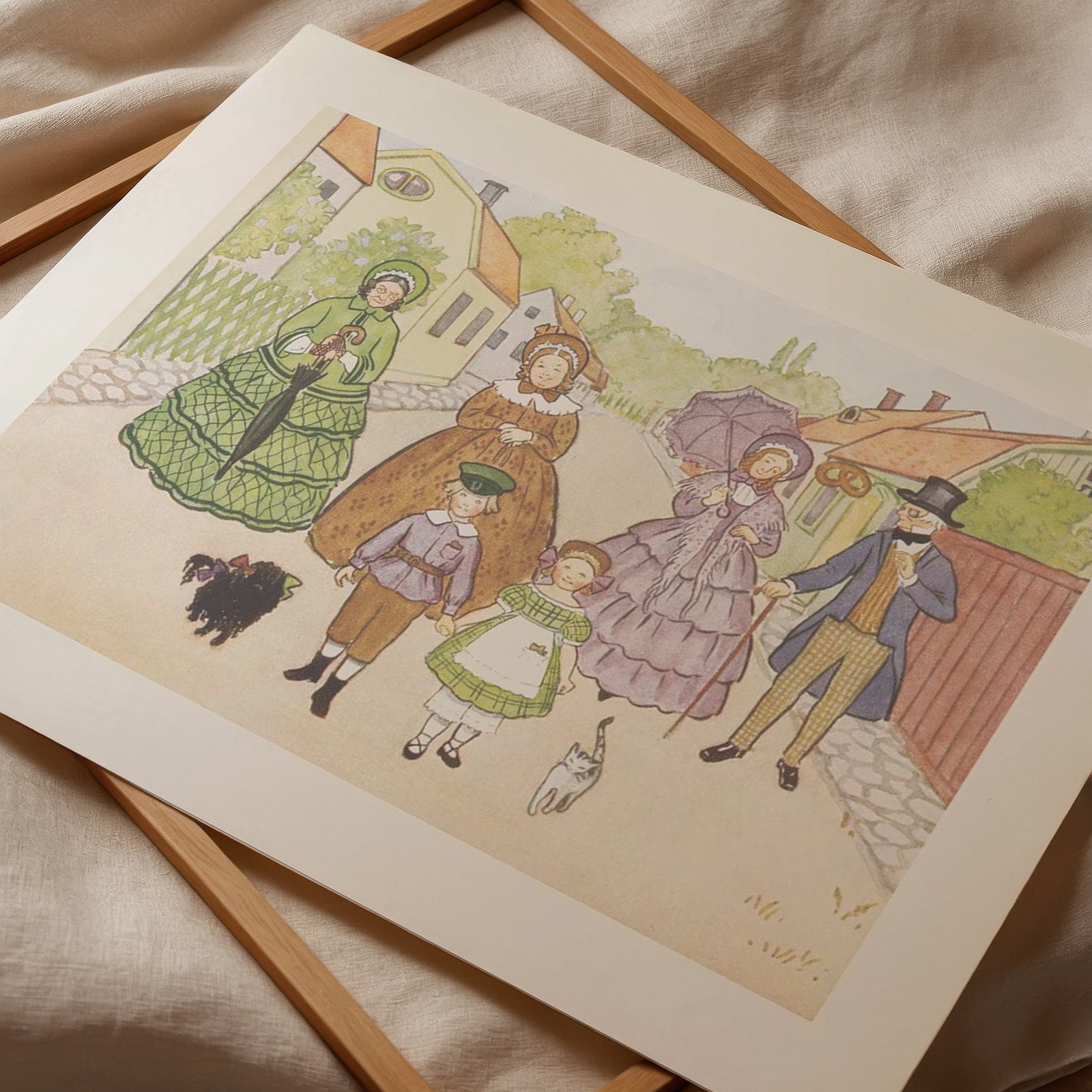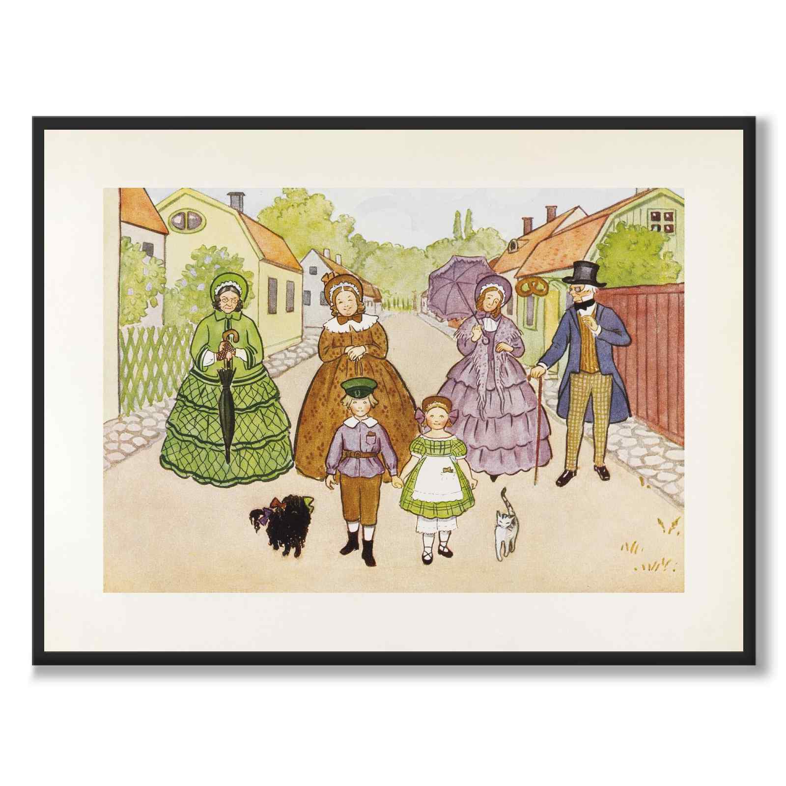 Illustrationen skildrar Tant Grön, Tant Brun och Tant Gredelin som promenerar tillsammans med Farbror Blå, pojken, flickan och deras lilla hund längs en idyllisk bygata. Den charmiga och livliga scenen utstrålar en stark känsla av gemenskap och värme, perfekt inramad av den lantliga miljön.
