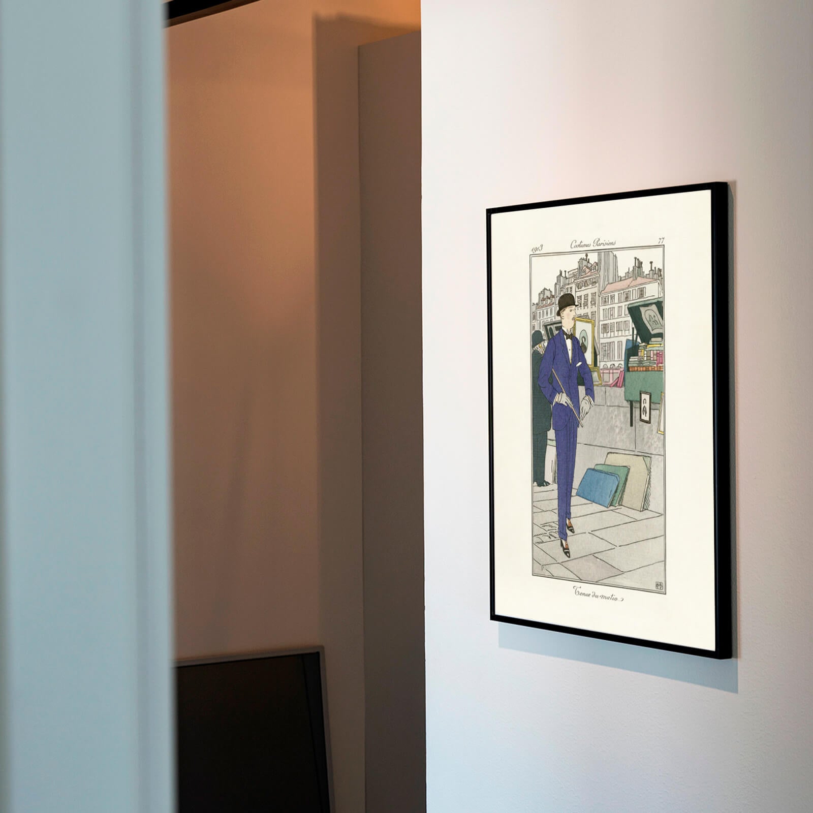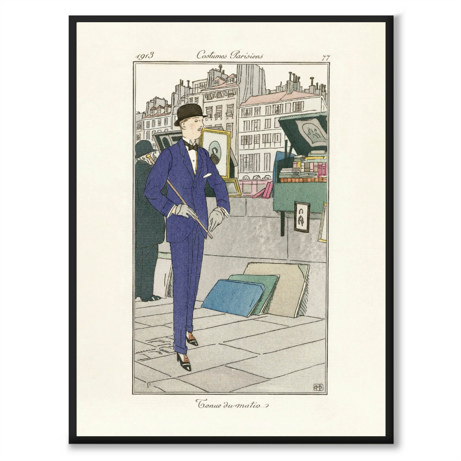 Poster med en illustration av en gentleman i Paris klädd i en blå kostym. Under bilden ser vi texten Tenue du Matin, franska för "morgon-outfit" eller "morgonklädsel". Mannen har en bowlerhatt på huvudet och en promenadpinne under armen. Han går längs några bouquinister eller bokbås på kajen längs Seinen i Paris.
