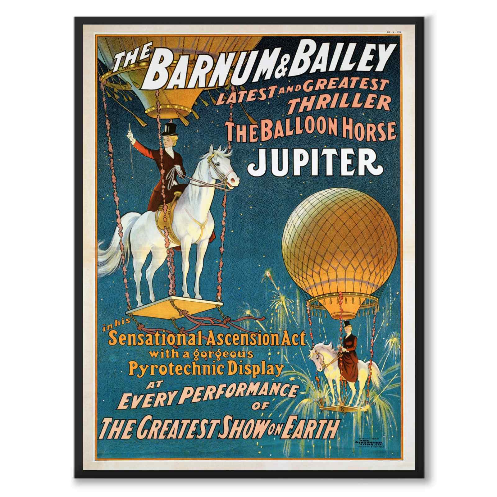 Affischen annonserar om "The Balloon Horse Jupiter", en av de stora attraktionerna på cirkusen, där en ryttare och häst utför ett hisnande ascension-act (uppstigning) med en luftballong.