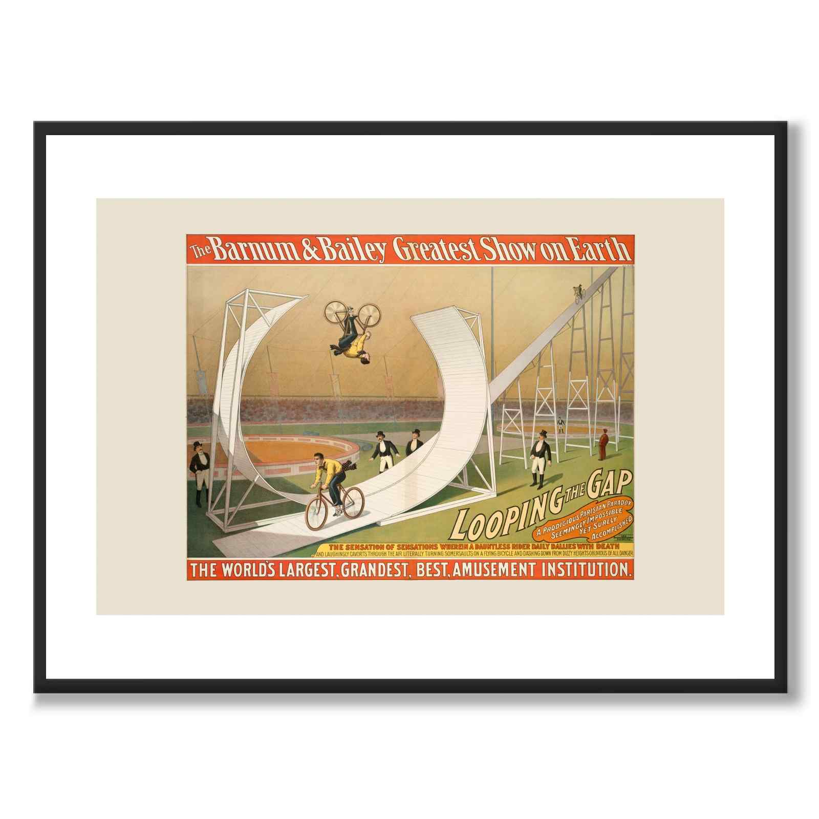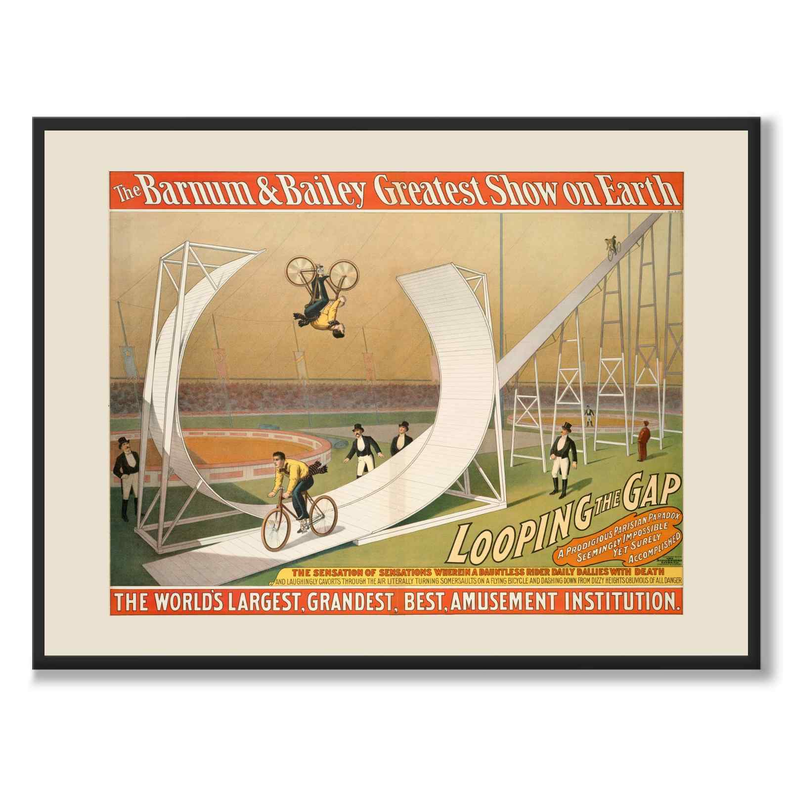 Affischen visar ett hisnande nummer, där en cyklist utför en farlig loop på en cykel genom en stor ramstruktur.