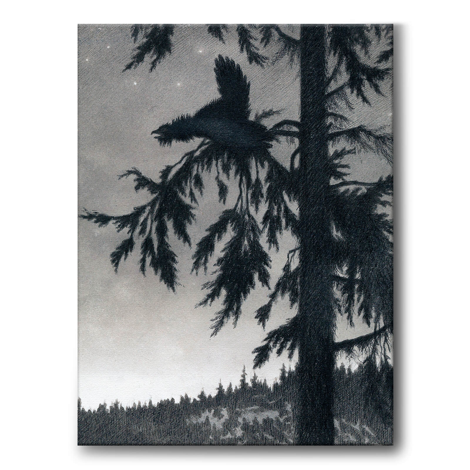 Canvastavla med målningen Tjädern spelar av Theodor Kittelsen (norsk titel: Tiuren spiller). Bilden visar ett vackert, mörkt naturlandskap i Norge. Det ärnatt och på himlen lyser stjärnorna. Högt uppe i en gran spelar en tjäder.