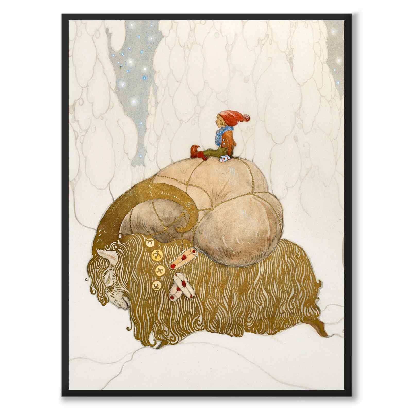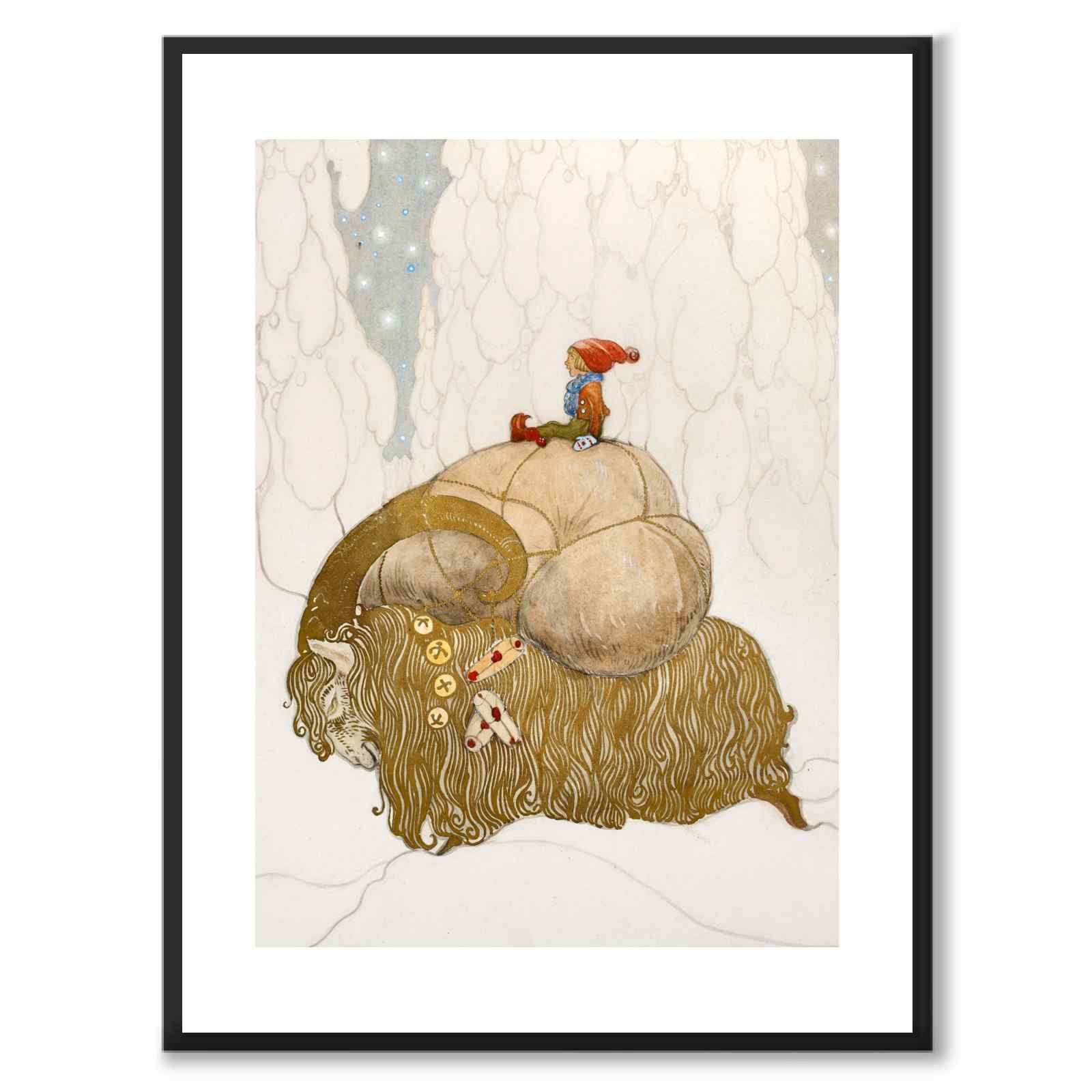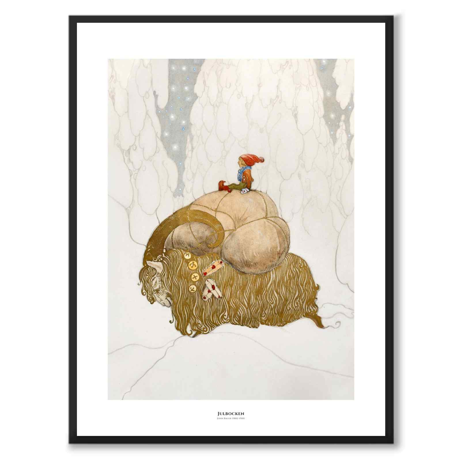 John Bauer gjorde flera målningar föreställande Julbockar och tomtenissar. Den här målningen skapade han år 1912 och kallas för Julbocken. Illustrationen var omslag för jultidningen med samma namn när den först publicerades.
