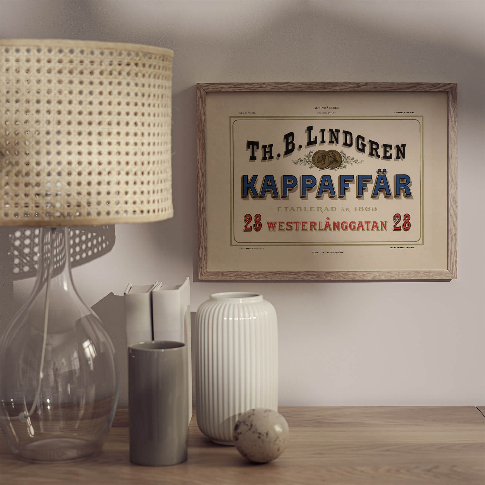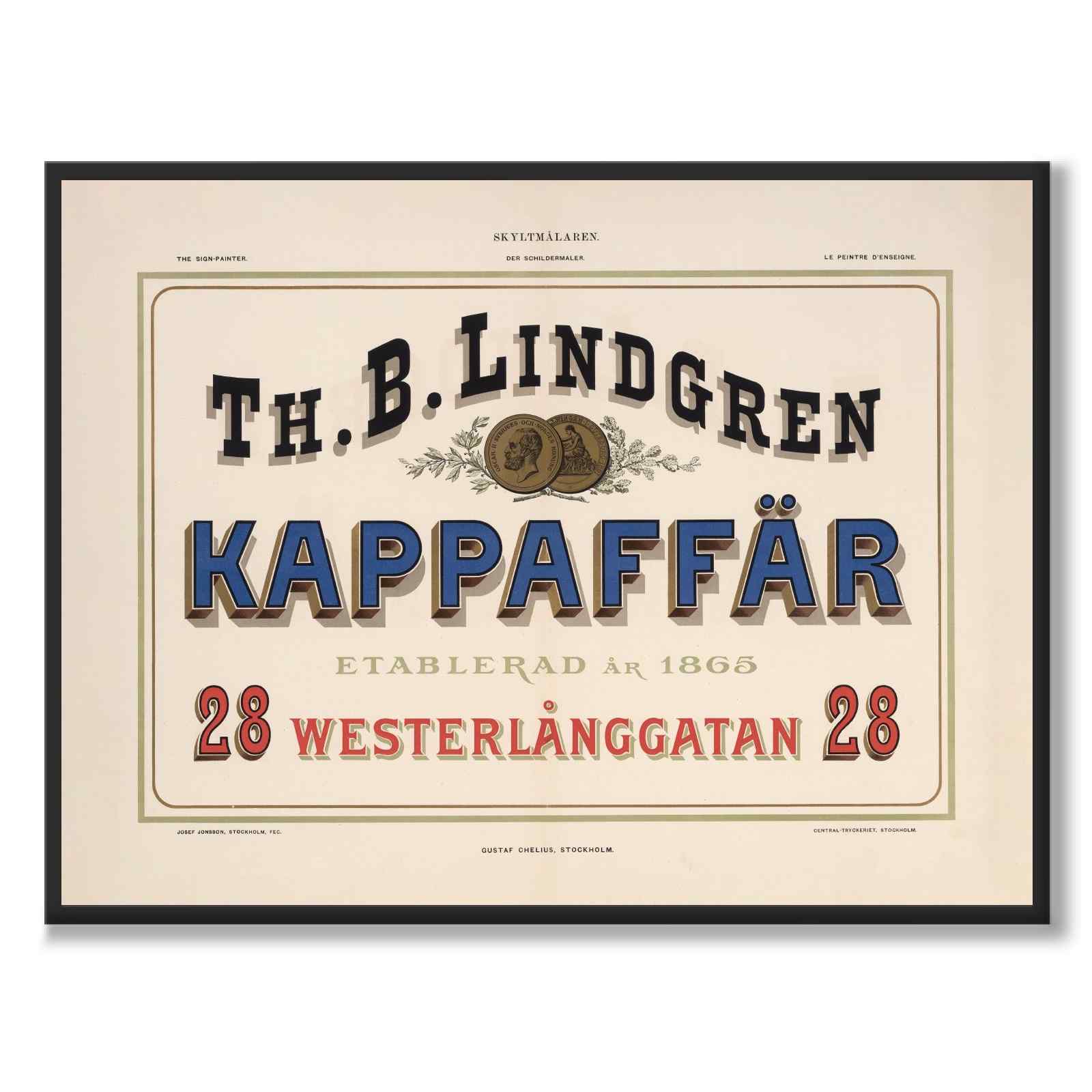 Poster med en gammal illustration från 1899. På bilden ser vi en fönsterskylt för Lindgrens Kappaffär. Firmanamn och adress är skrivet i vacker tidstypisk typografi. Westerlånggatan 28 eller Västerlånggatan som den heter idag ligger i Gamla Stan, Stockholm.