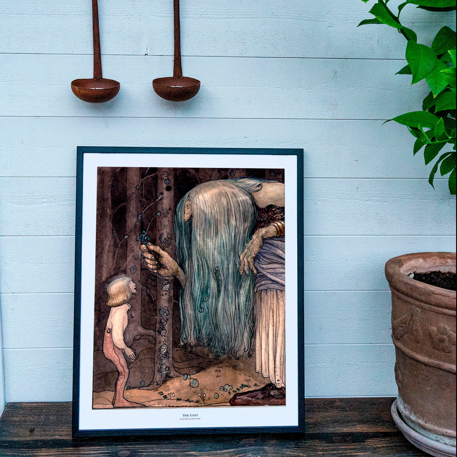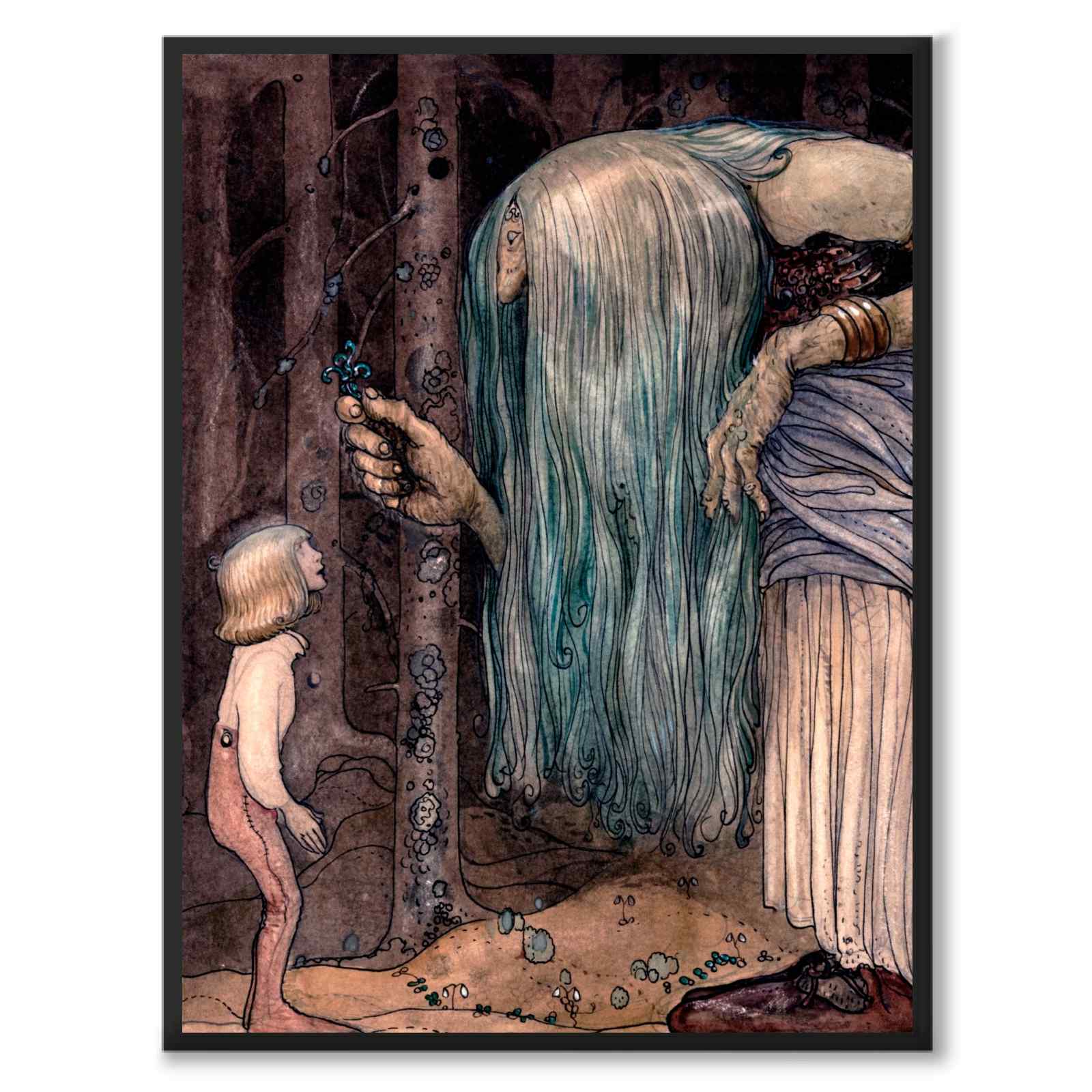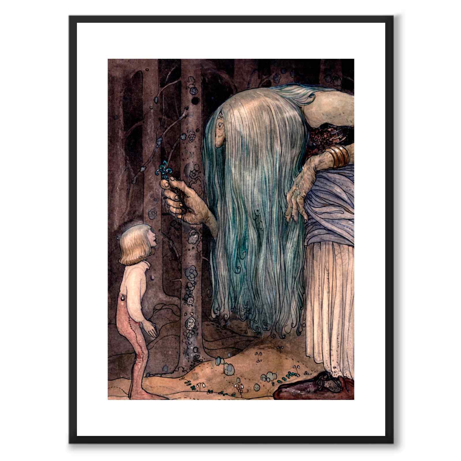 Poster med John Bauers målning Trollörten från 1912. Ett troll med långt, grönt hår överräcker en trollört till pojken i skogen.