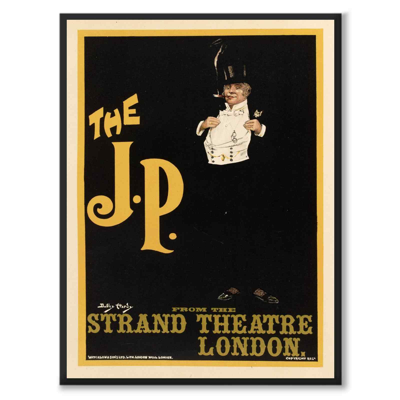 På denna affisch syns en man som är klädd i formell, elegant klädsel, troligen en frack eller liknande, och han är framträdande i centrum av bilden. Till vänster står texten "The J.P" med stora bokstäver i gul text. I denna affisch ser vi en mer enkel och stiliserad design jämfört med många av Chéret’s andra verk.